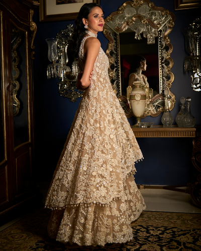 Experience the beauty and elegance of this Nude high-low sharara set with its intricate detail and luxurious embroidery. The matching jacket and dupatta feature a plunging neckline with bead and crystal detail. The dupatta is finished with scallop edging and pearl and crystal tassels. Perfect for a special occasion.