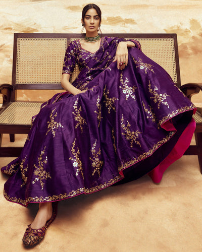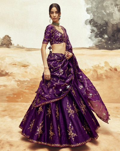 Indulge in the royal charm of our ranisa baingani lehenga set from our couture capsule. The baingani tissue lehenga features intricate patra ka kaam and dori accents, adding to its regal opulence. Designed for both comfort and grandeur, this lightweight set is a testament to true luxury.