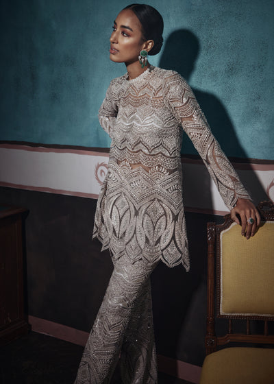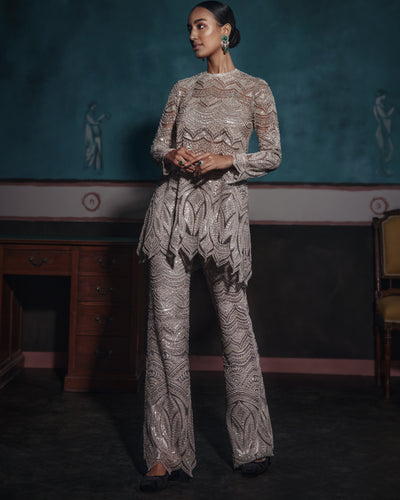 Elevate your wardrobe with the rhythm pants set. The silver net top, donned with statement embroidery, artfully combines modern elegance with exquisite craftsmanship. The matching bottoms, featuring intricate scallop embroidery, exude opulence and polished luxury. Perfect for those who appreciate sophistication in every stitch.