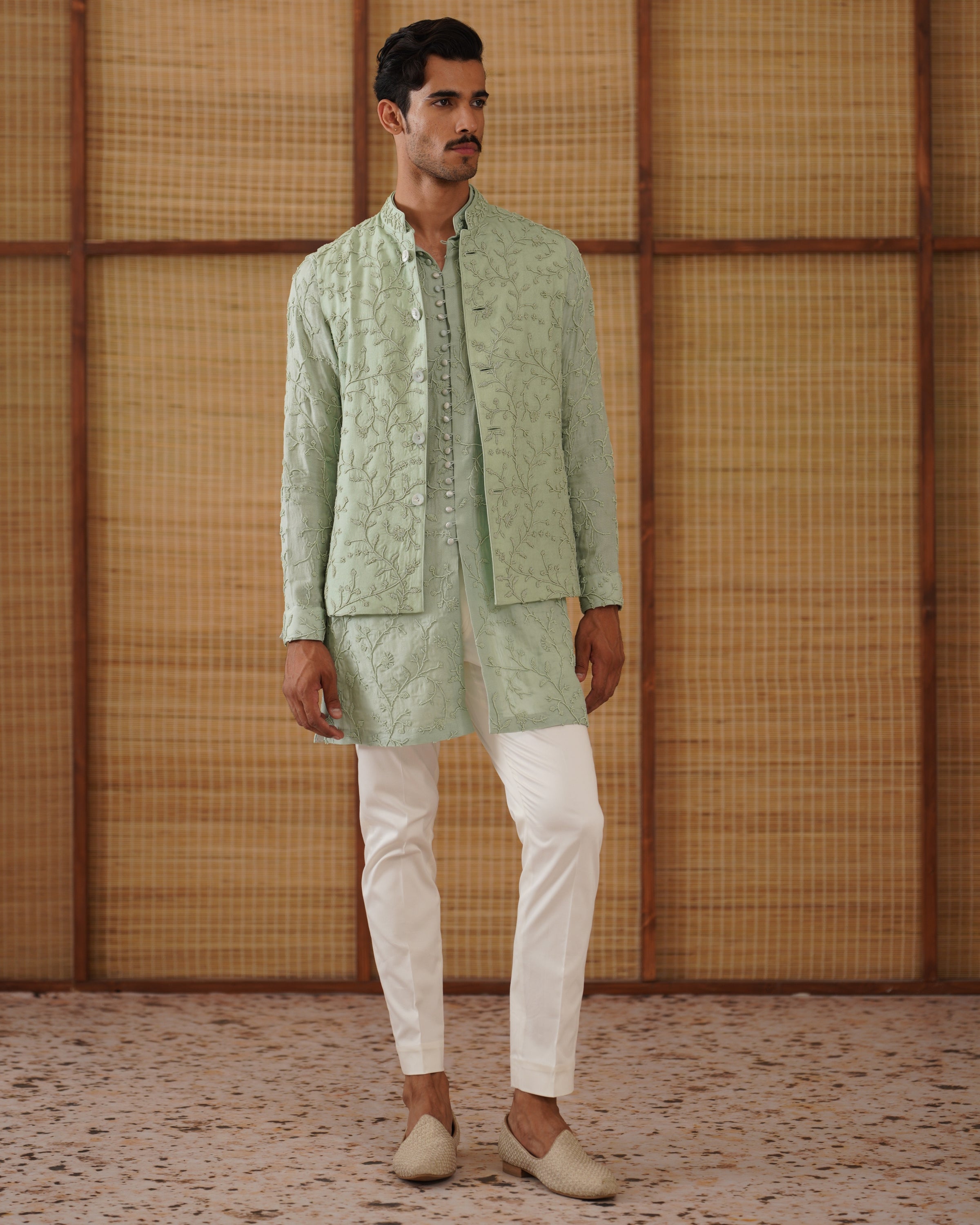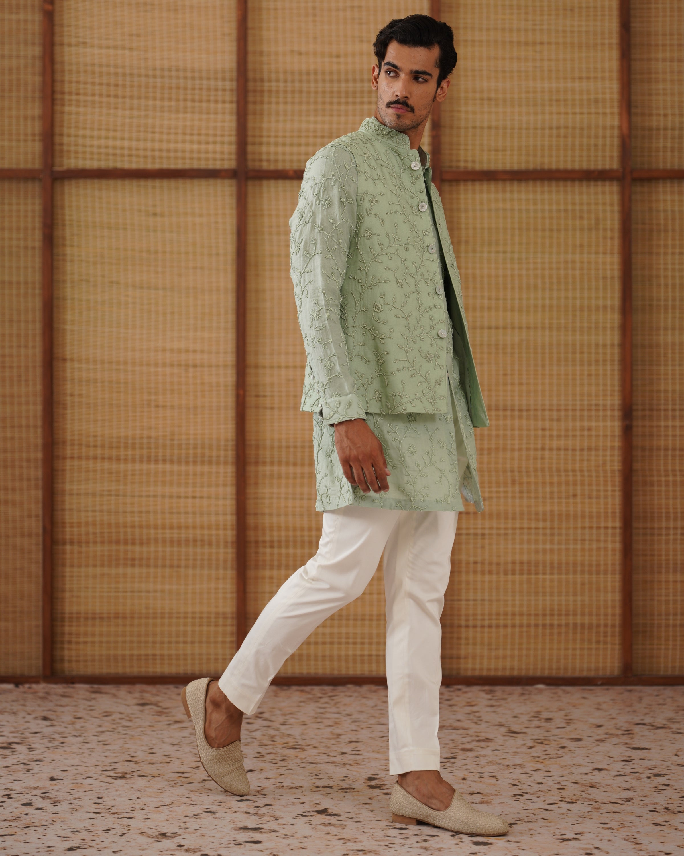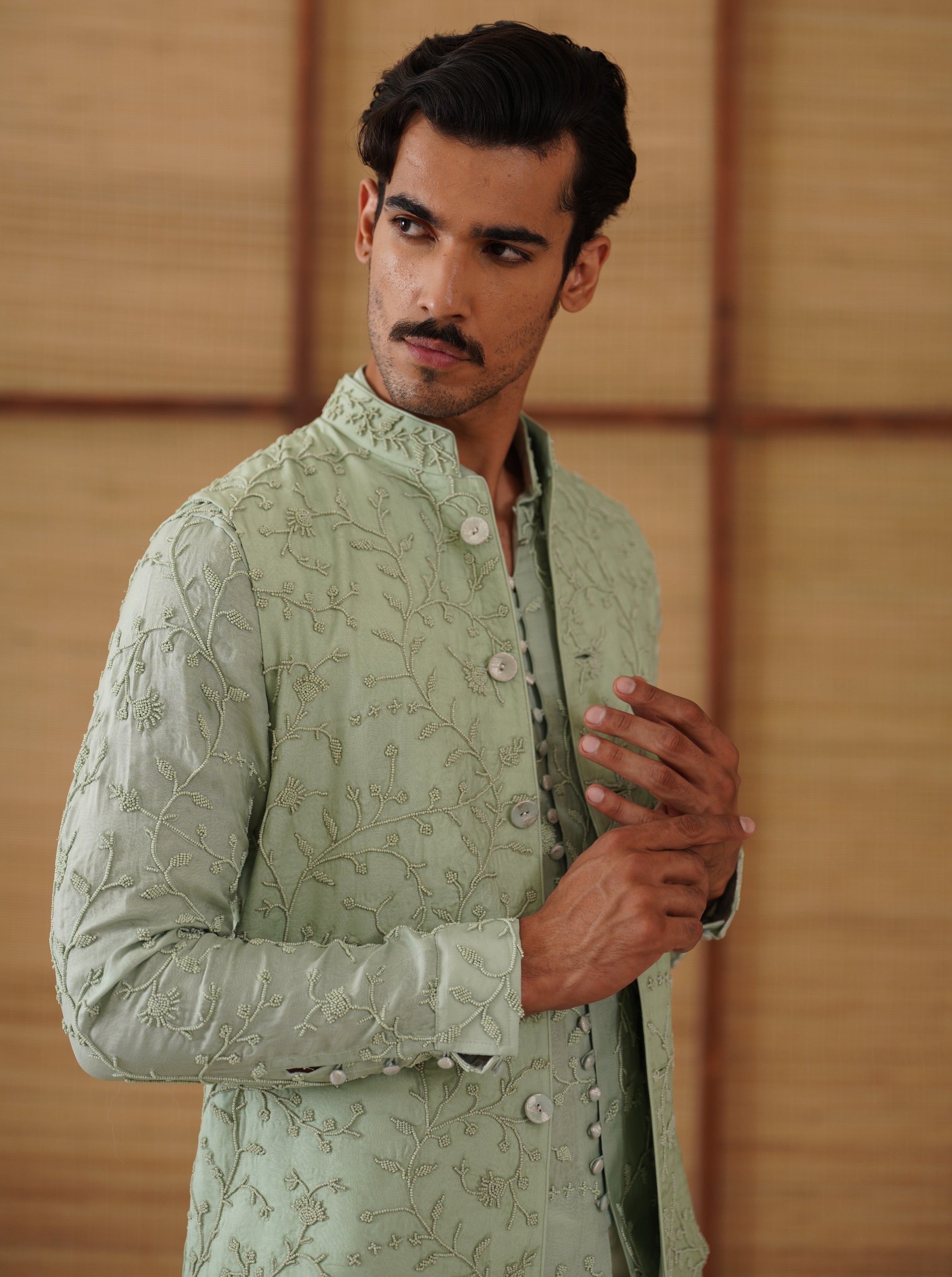 Elevate your wardrobe with the Sage green banarsi nehru jacket set, featuring a hand-embroidered bead jacket crafted from sheer pure organza layered over luxurious moga silk for a rich, dimensional look. This sophisticated ensemble includes a matching loopy-button embroidered kurta and classic churi pants, blending traditional craftsmanship with elegant design for a refined and timeless appeal.