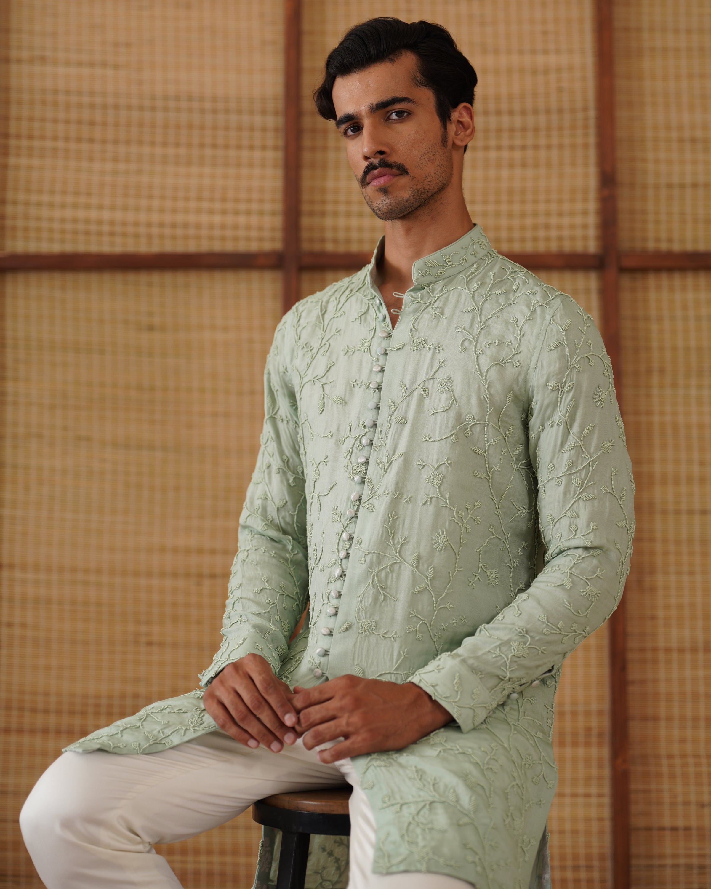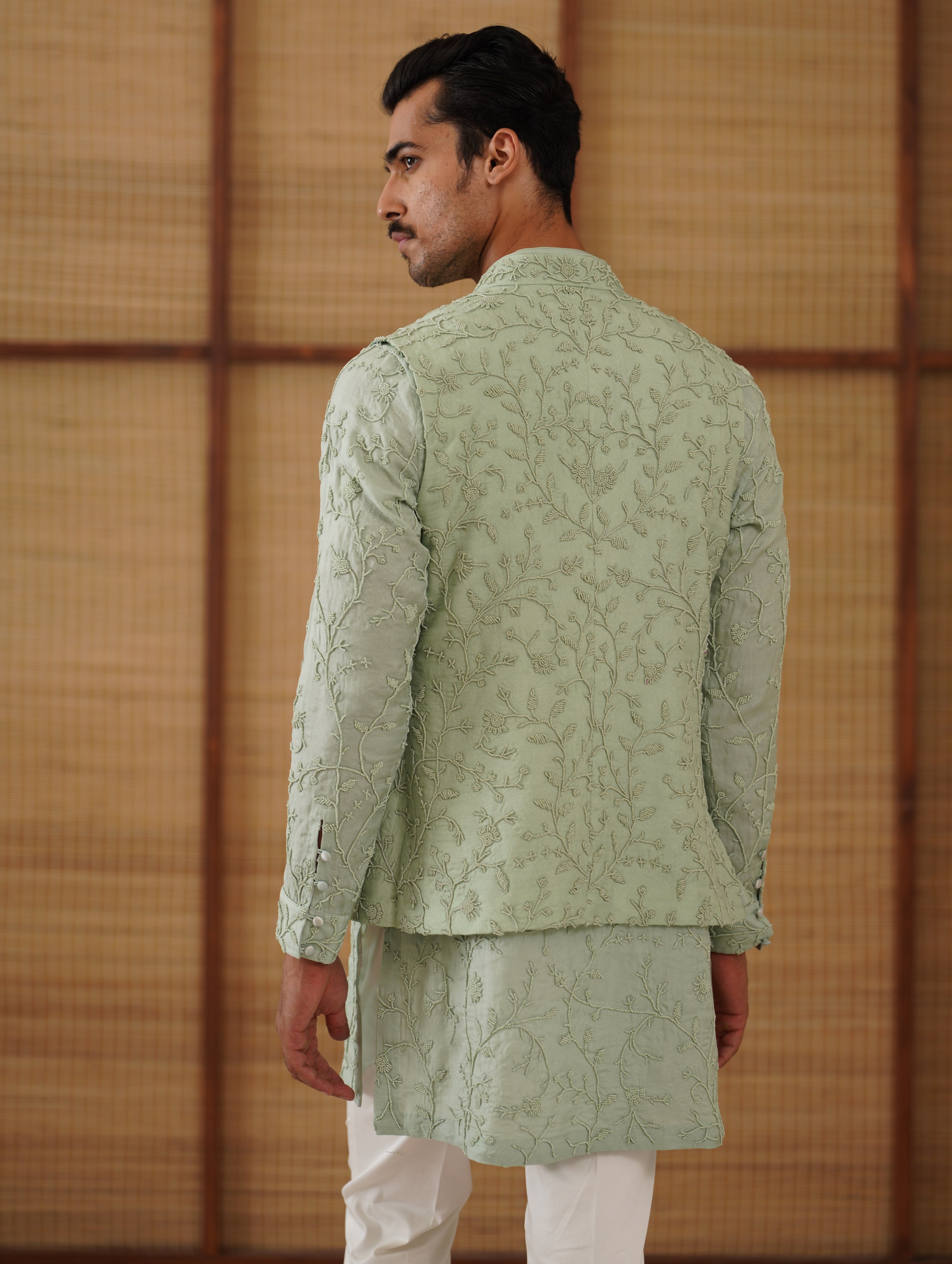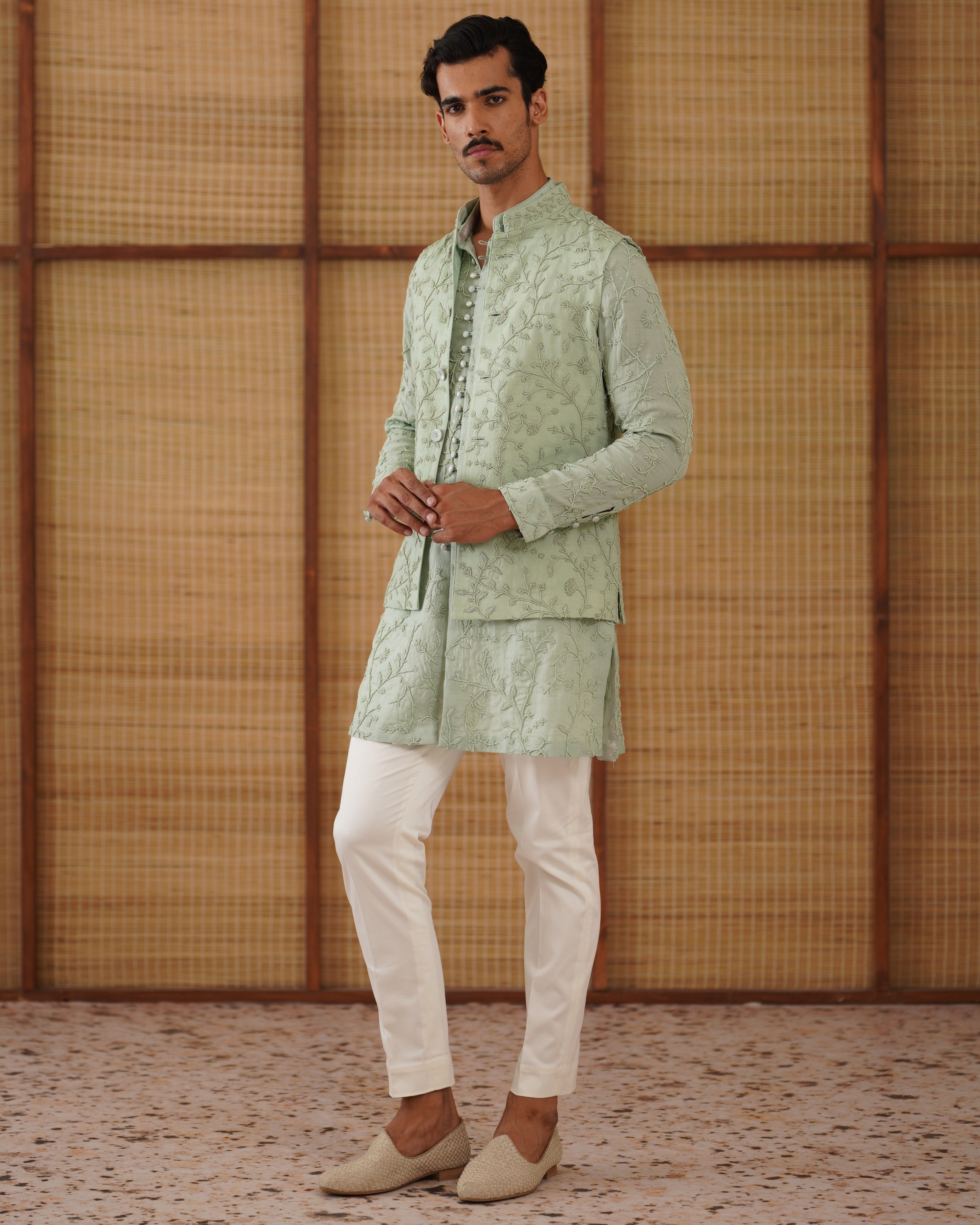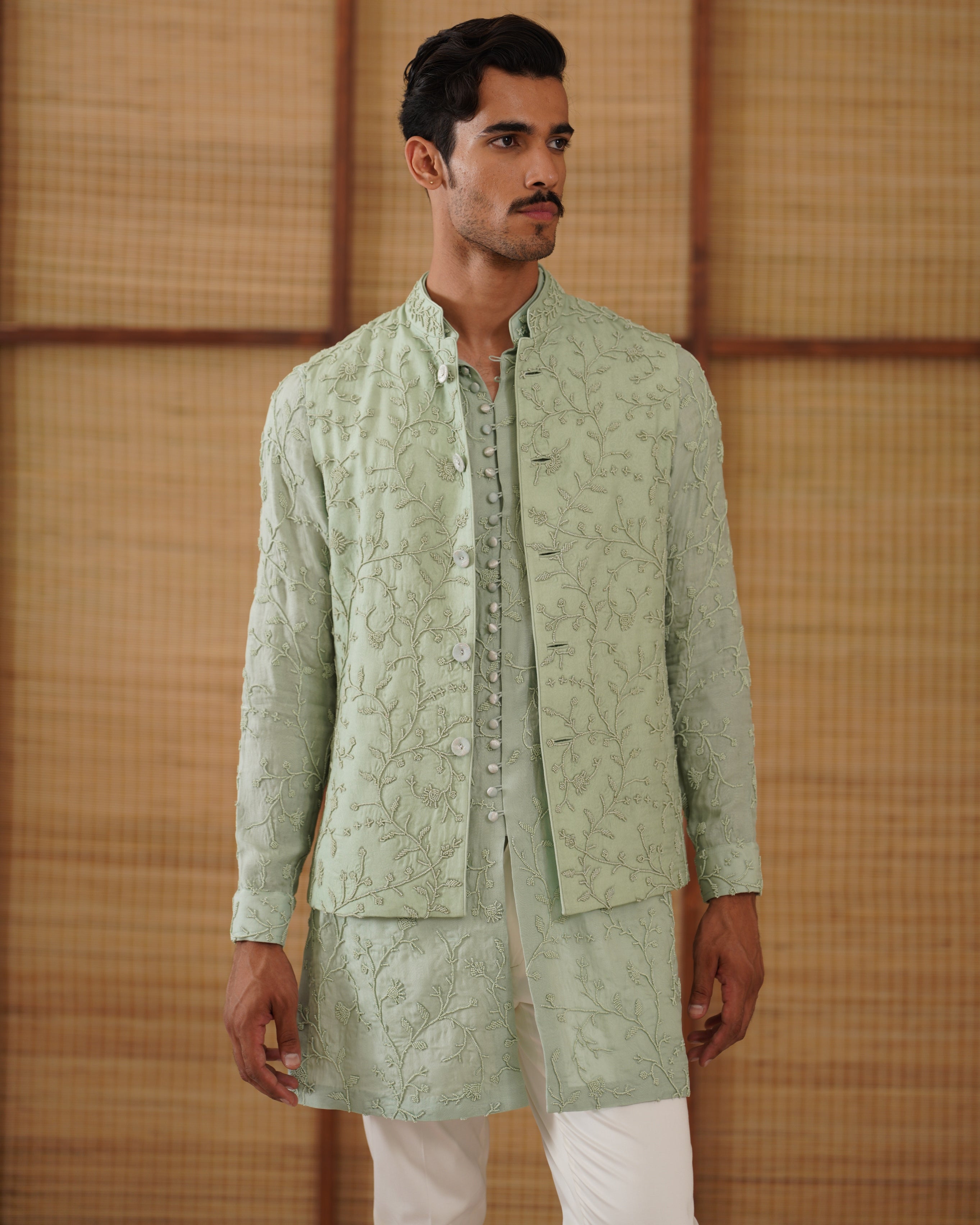 Elevate your wardrobe with the Sage green banarsi nehru jacket set, featuring a hand-embroidered bead jacket crafted from sheer pure organza layered over luxurious moga silk for a rich, dimensional look. This sophisticated ensemble includes a matching loopy-button embroidered kurta and classic churi pants, blending traditional craftsmanship with elegant design for a refined and timeless appeal.