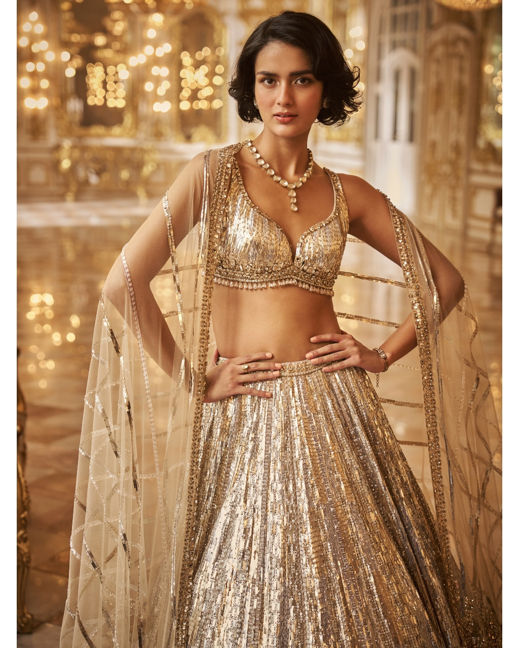 Crafted from a blend of Silver and gold crystals and sequins, this lehenga set is a stunningly beautiful choice for special occasions. Intricate details like tassels at the waist of the blouse and the four sides of the dupatta add an extra touch of elegance. Its versatility means you can also style the outfit with an organza blouse for a unique look.
