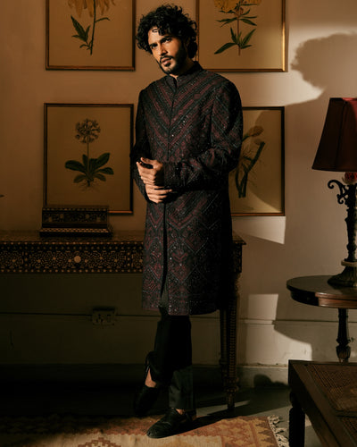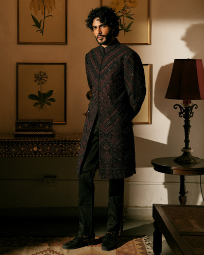 Indulge in luxury with our vidyut sherwani set. This elegant and sophisticated ensemble is tailored to perfection, with intricate details and quality craftsmanship. Embrace the exclusive style and timeless beauty of this set, perfect for any special occasion. Elevate your wardrobe and make a statement with vidyut sherwani set.