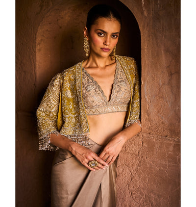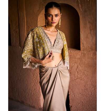 Indulge in luxury with our golden beige Wrap skirt set. This exquisite set features a beautifully embroidered cape paired with a blouse and wrap skirt, creating a stunning and sophisticated look. Elevate your style with this exclusive set, perfect for any occasion.