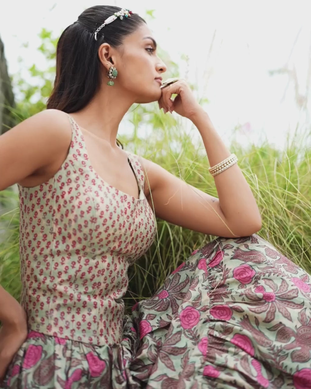 An exclusive collaboration between KYNAH and Drishti & Zahabia, the Irsa Skirt Set features a vibrant avocado-printed base adorned with delicate pink florals. The ensemble includes a full-length corset blouse with a chic tie-up back and a layered skirt that adds volume and movement. Romantic, modern, and effortlessly elegant, this set is perfect for festive occasions, weddings, or celebrations that call for a standout look.
