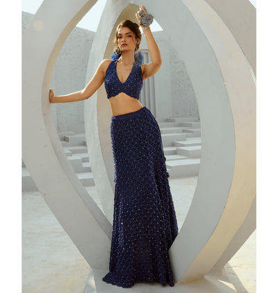Elevate your style with our luxurious Medusa skirt set. The deep blue sequence and glassbeads encrusted lehenga and halter neck blouse exude sophistication and opulence. Complete the look with the delicate tulle dupatta for a truly exclusive and elegant ensemble.