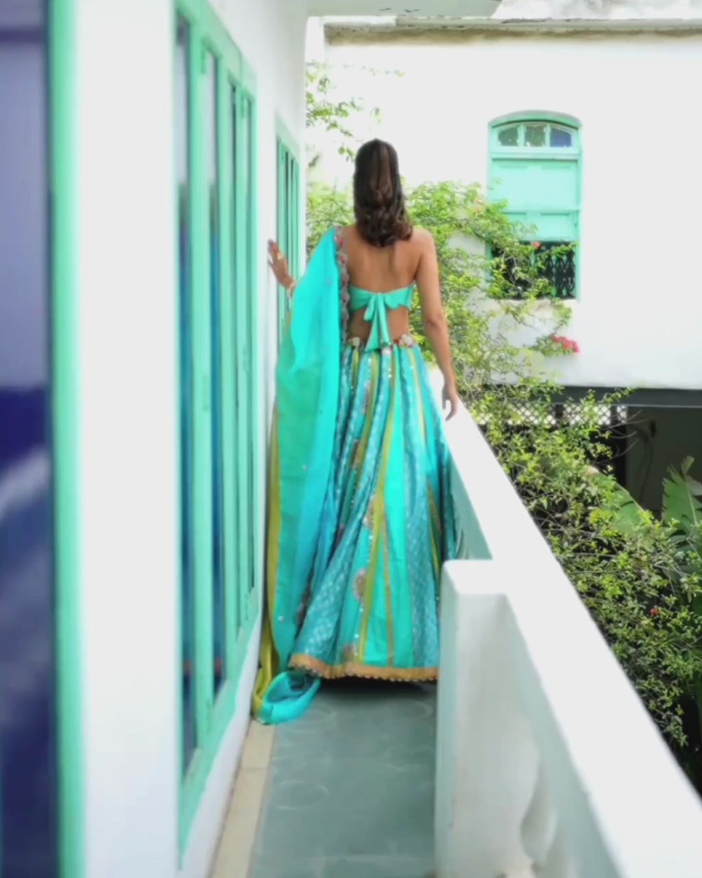 An exclusive collaboration between KYNAH X AUM Ashima & Asit, the Naz Lehenga Set features a heavily embellished halter neck blouse with a tie-back detail, paired with a paneled blue embroidered silk lehenga. An ombre green and blue organza dupatta completes the look. Perfect for a Mehendi or Sangeet celebration.