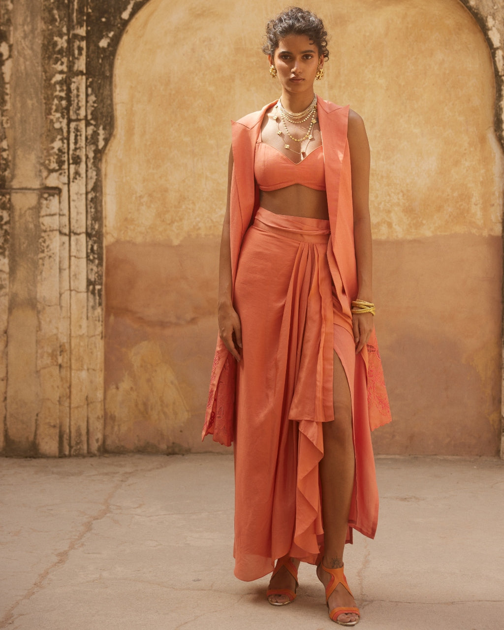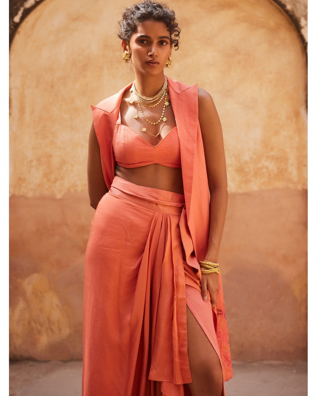 Our peach orange linen jacket set exudes a chic and stylish appeal. Crafted from a blend of linen and silk organza, the jacket and blouse offer a lightweight and comfortable fit. The intricate cutwork design on the jacket, featuring our signature floral motif, adds a touch of elegance. The skirt, with its pre-stitched wrap details and full lining, completes this sophisticated ensemble. Perfect for any occasion.