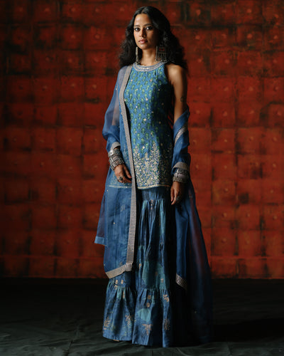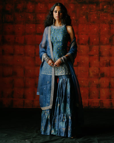 The rima indigo sharara set is the perfect combination of traditional and modern styles. Made from luxurious dupion silk, this set features an indigo printed sharara with elegant gold zari details. The intricately embroidered halter tunic adds a touch of glamour, while the embroidered organza dupatta completes the look. Elevate your wardrobe with this unique and stylish ensemble.