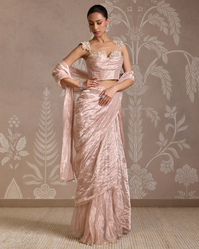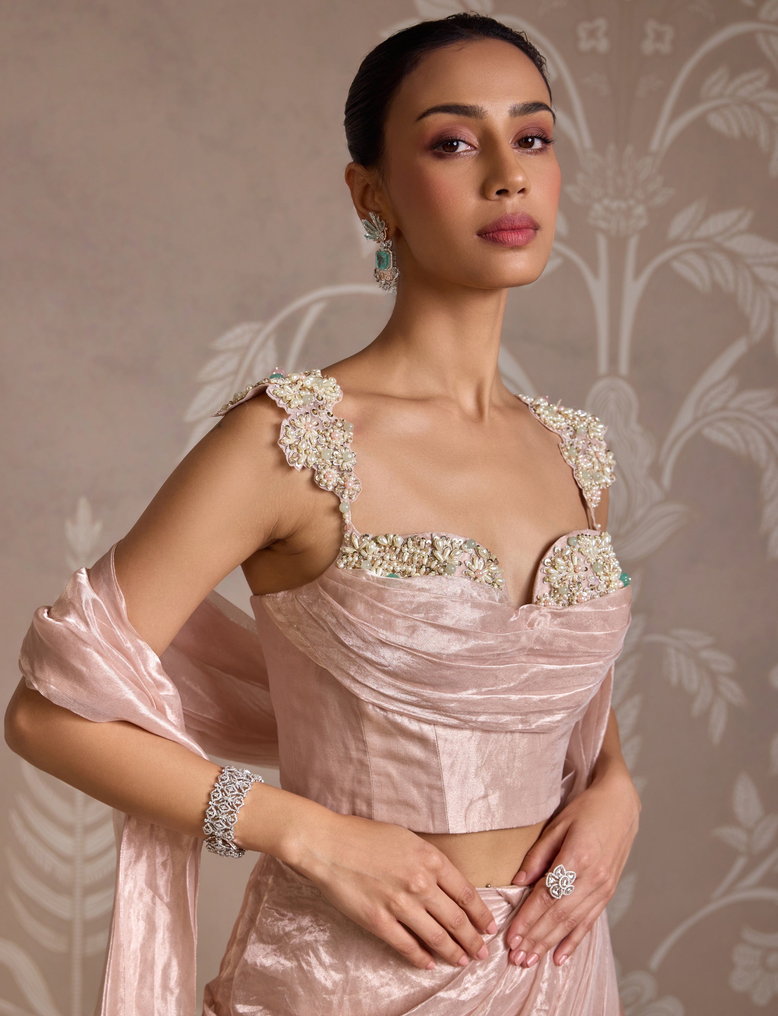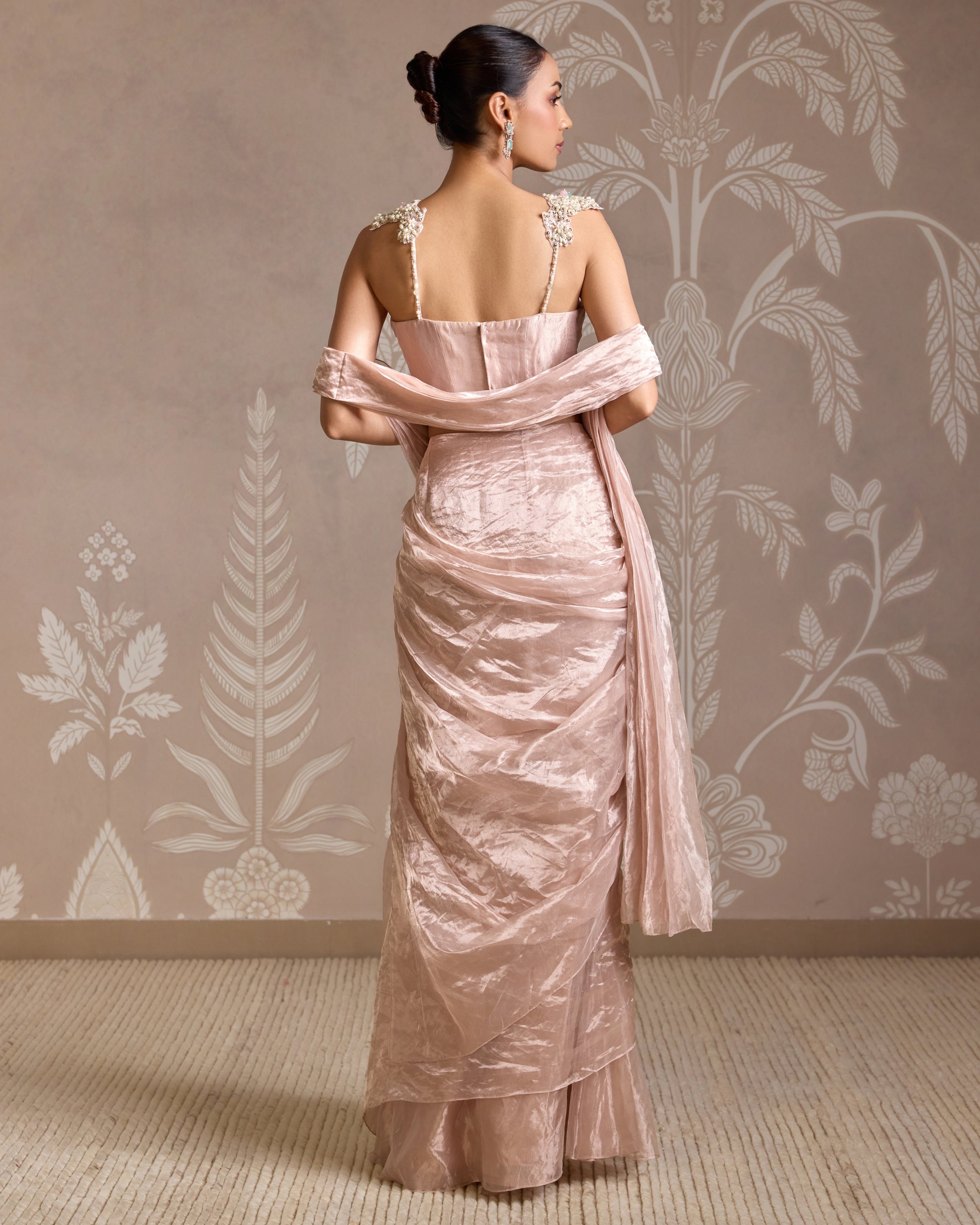 Discover the timeless beauty of our Rose gold hem pre stitched sari set. Expertly crafted with tissue fabric, this set features a stunning embroidered corset and a ruffled saree. Embrace effortless elegance with this pre-stitched set, perfect for any special occasion.