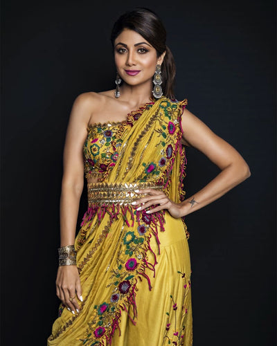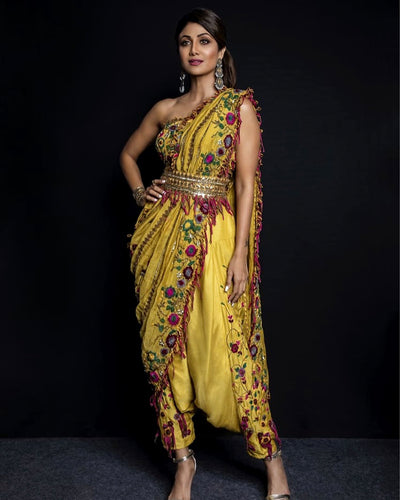 Take a note from Shilpa Shetty in this mustard yellow dhoti sari. Bright mustard dhoti pants are paired with a one-shoulder blouse and a pre-stitched dupatta adorned in colorful thread embroidery. Finish off this fun look with the gold belt.