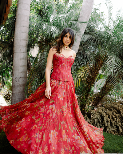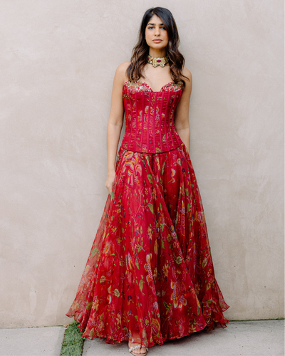 Crafted from luxurious organza, the Sophia Gown features a strapless corset top with an attached printed skirt. With its timeless design and intricate details, this gown is the perfect statement piece for any special occasion.