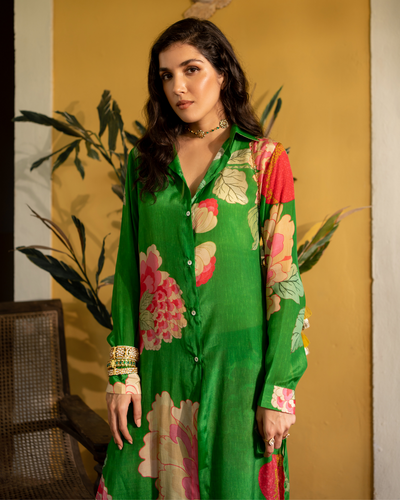 Hues of moody green and luminous pink adds charm to the placement printed set. The kurta has a button-front placket with a shirt collar, long sleeves, and a side slit. It is teamed with pants. This chic and classic silhouette is passed on from one generation to another.