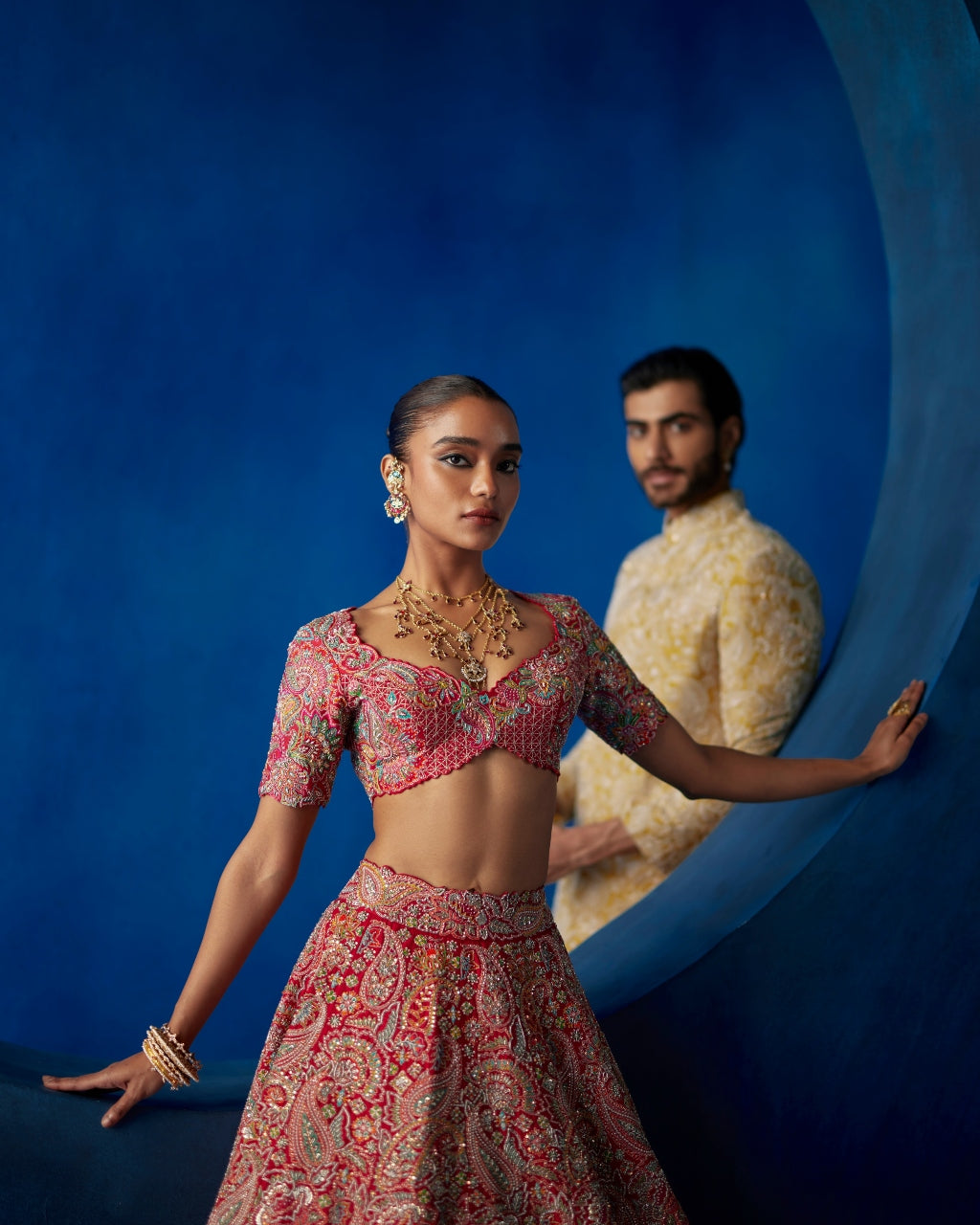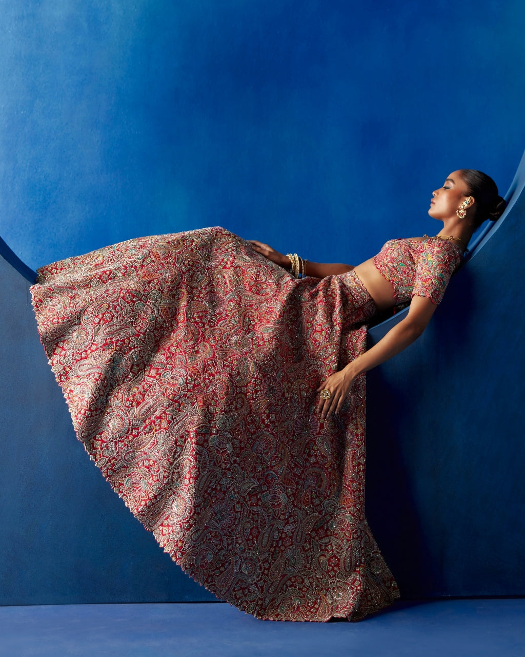 Elevate your occasion wardrobe with this exquisite Ahvi lehenga set. Boasting a red lehenga with pure silk dupatta, the set is finished with a resham and zardozi hand embroidered blouse featuring beautiful badla checks texture. Crafted from the finest fabrics, this gorgeous set is sure to make a lasting impression.