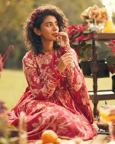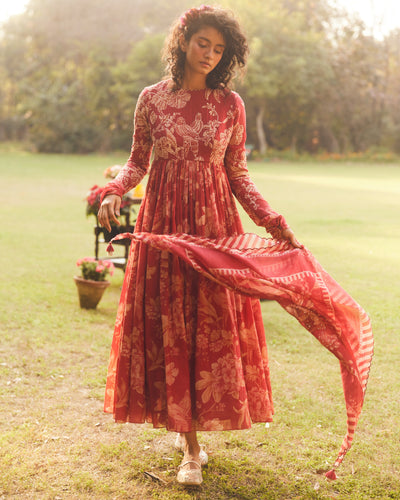 Elevate your summer wardrobe with our lark anarkali set. Tailored from soft malai chanderi, this exquisite set is adorned with our signature print of florals and birds, showcasing a refined summer aesthetic. Hand-embroidered details on the yoke and sleeves add a bespoke touch, while the flowing scarf completes the elegant look.