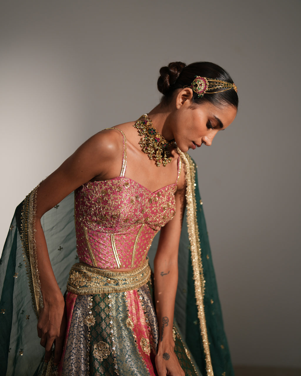 Crafted from luxurious raw silk, the Twilight Lehenga Set features intricate embroidery that enhances its timeless appeal. The blouse and lehenga showcase meticulous craftsmanship, while the net embroidered dupatta adds a delicate, ethereal finish to the ensemble. Perfect for special occasions, this set combines rich textures and detailed artistry for an elegant and sophisticated look.
