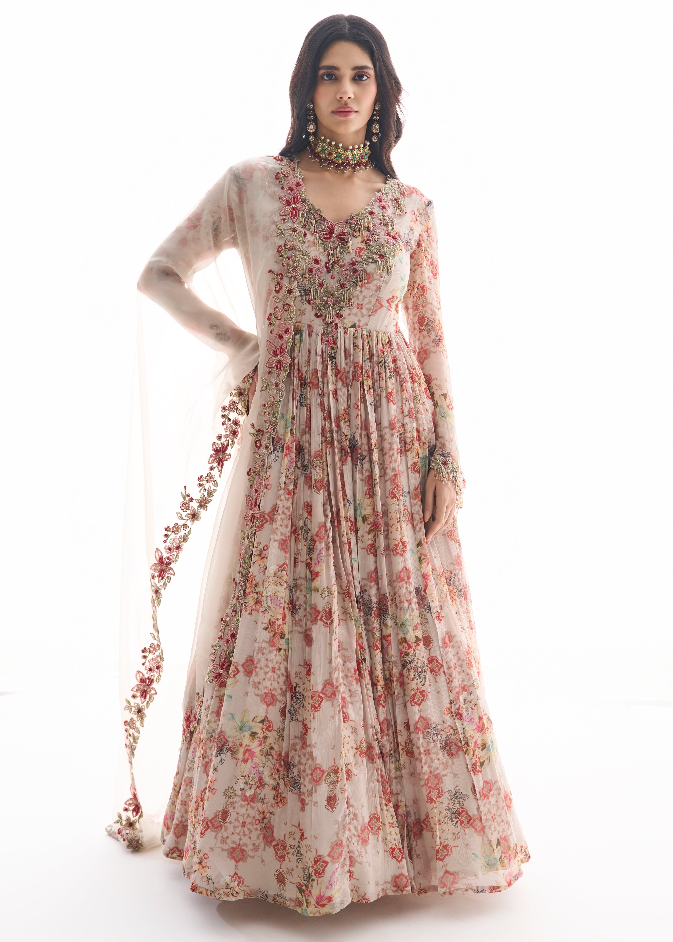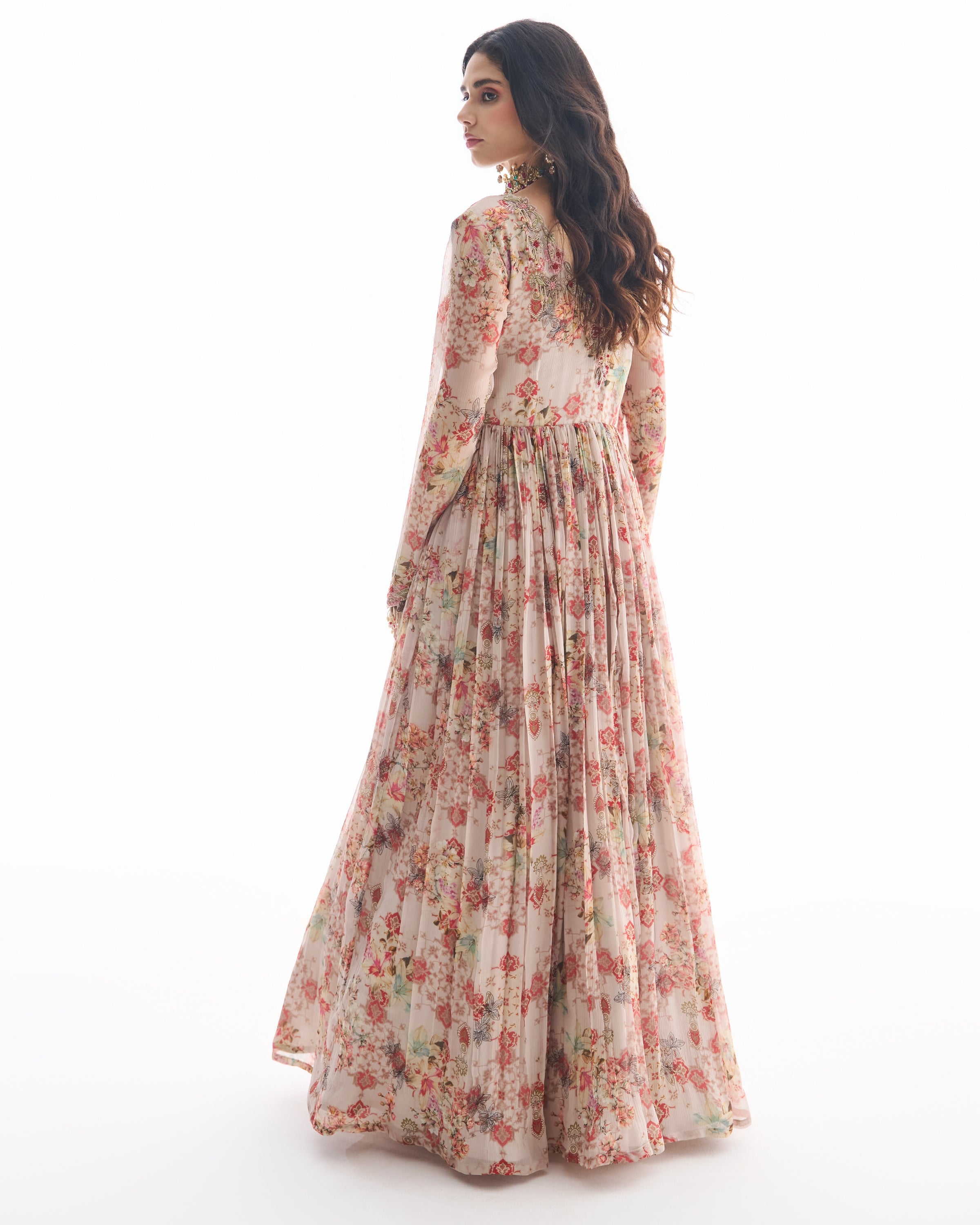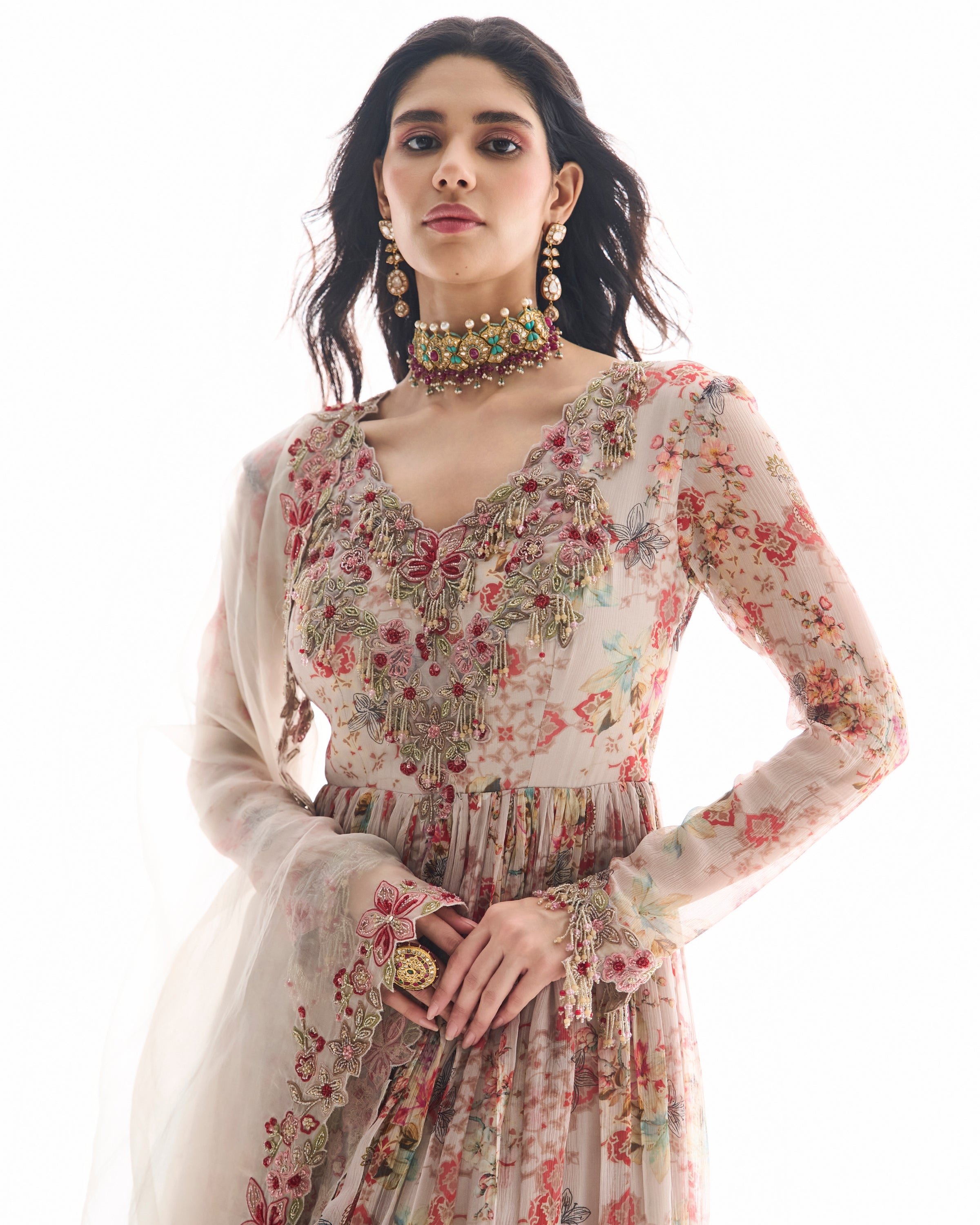 Elevate your festive wardrobe with the Aksah anarkali set, crafted from soft chiffon that flows gracefully in a pleated silhouette. Its delicate multicolored floral print is complemented by intricate embroidery on the yoke and richly embellished bodice, adding a touch of regal elegance. Full-length sheer sleeves and a coordinating dupatta with embroidered accents complete this sophisticated ensemble, perfect for weddings and special celebrations.