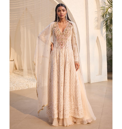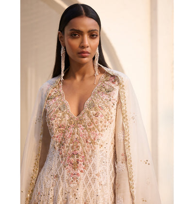 Indulge in the height of elegance with our Allure chikankari kalidaar set. Featuring arcadia white chikankari and zardozi embroidery, this set exudes sophistication. The intricately detailed kurta and delicate organza dupatta create a classic and captivating look. Elevate your style with this luxurious set.