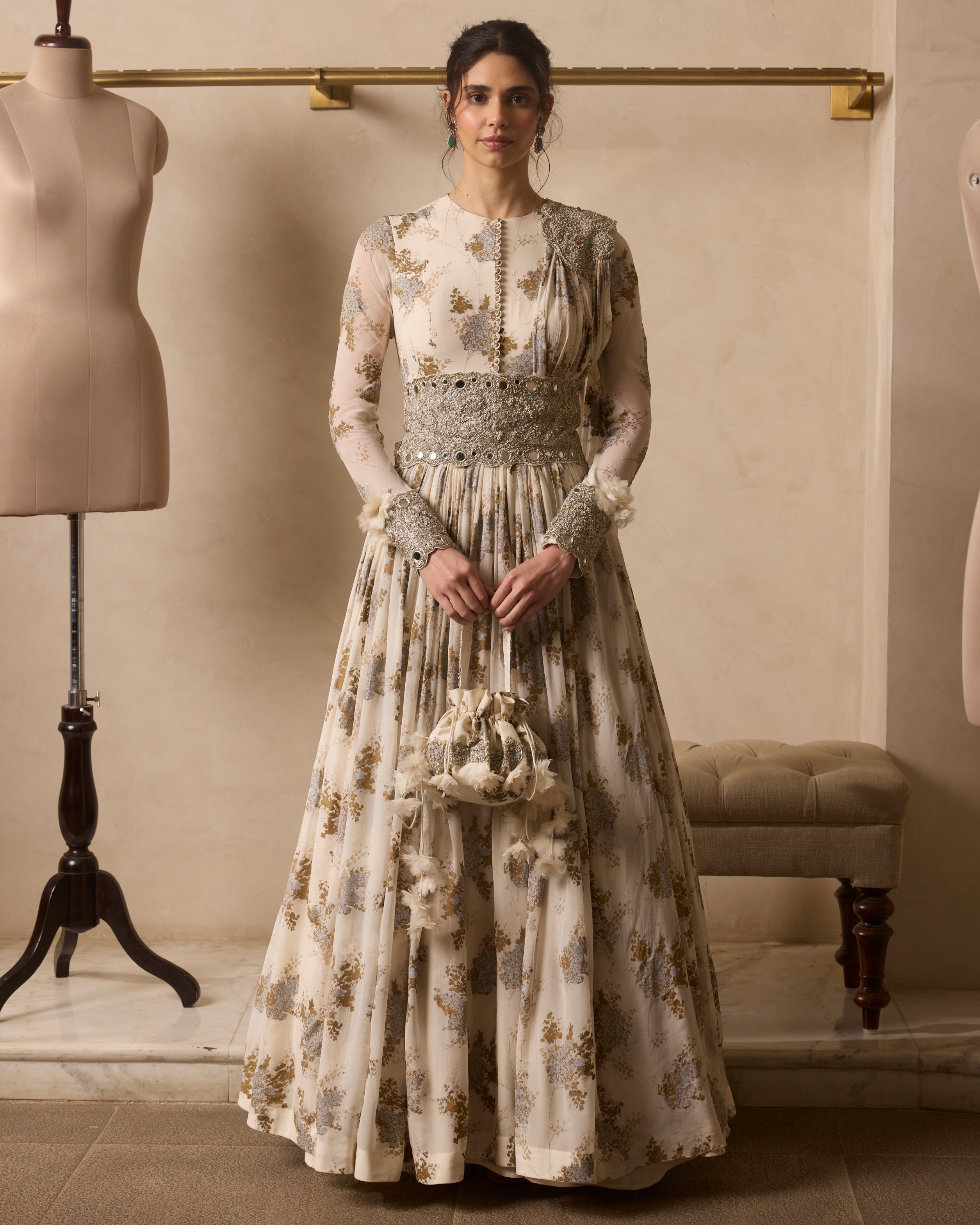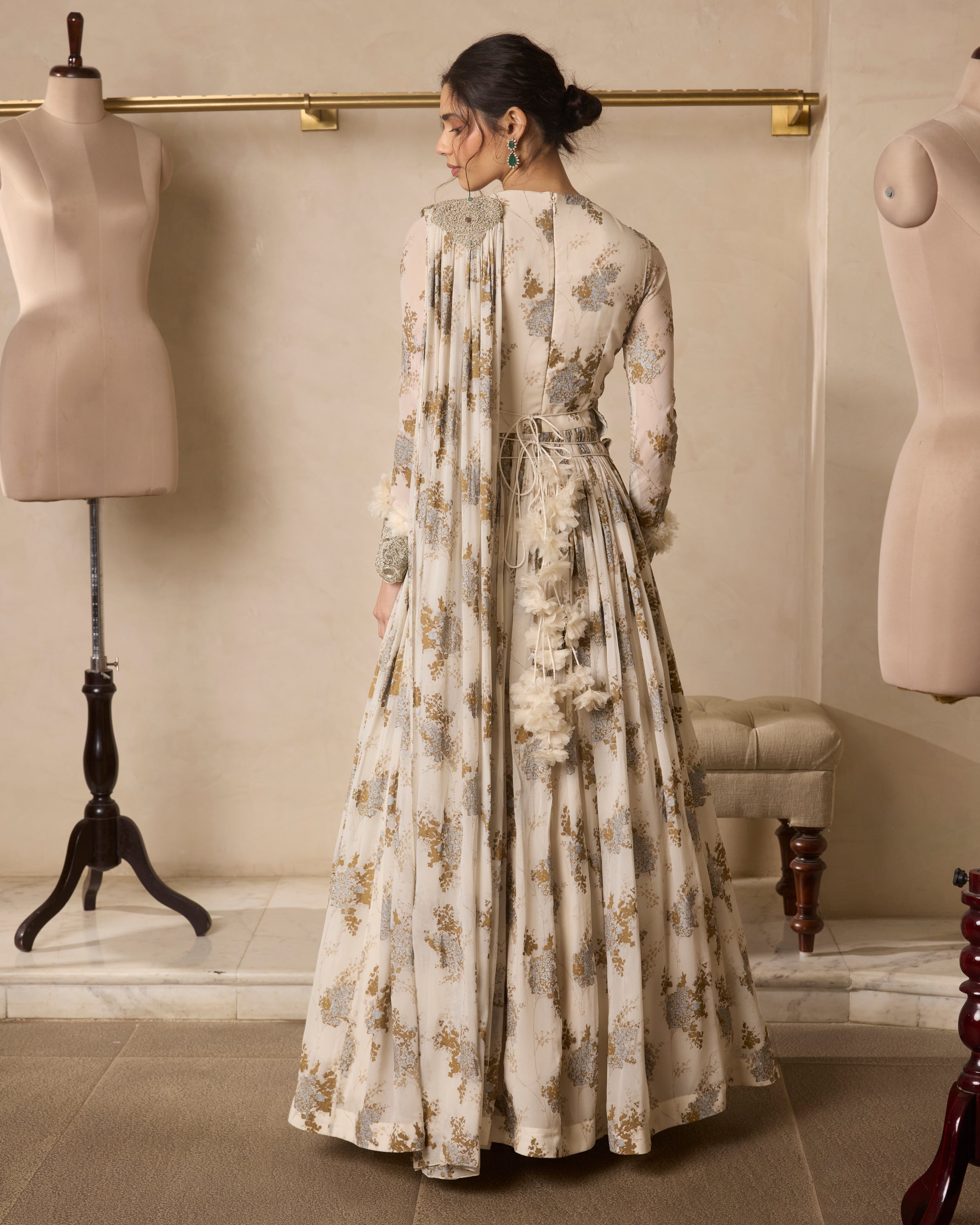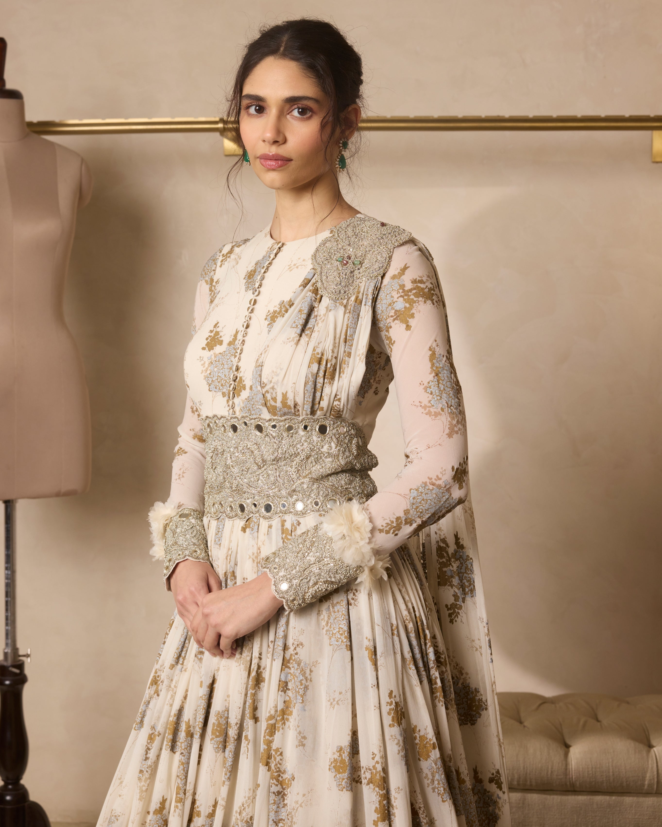 Elevate your wardrobe with the Ara anarkali set, showcasing an elegant ivory sylvia print. This ensemble features a gracefully flowing anarkali paired with an attached dupatta for seamless style. An intricately embroidered belt accentuates the waist, adding a refined touch to this sophisticated look. Perfect for special occasions, this set combines traditional charm with contemporary elegance.
