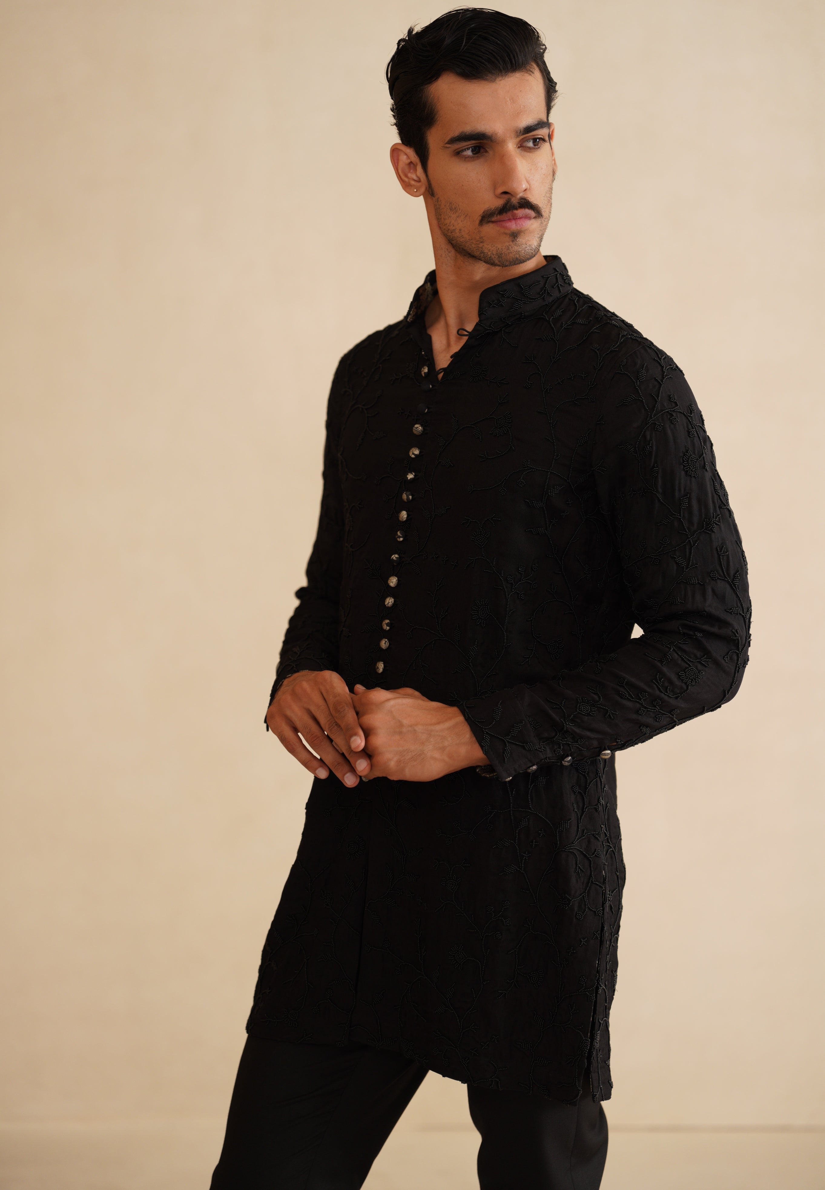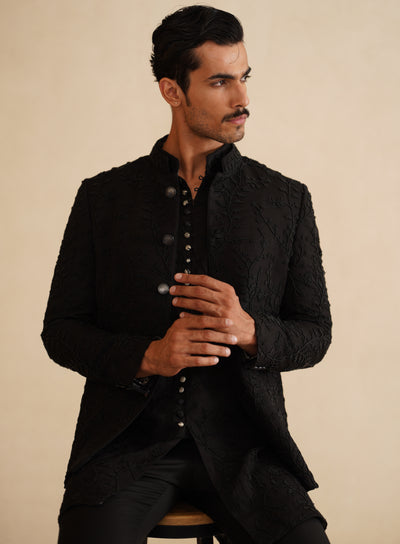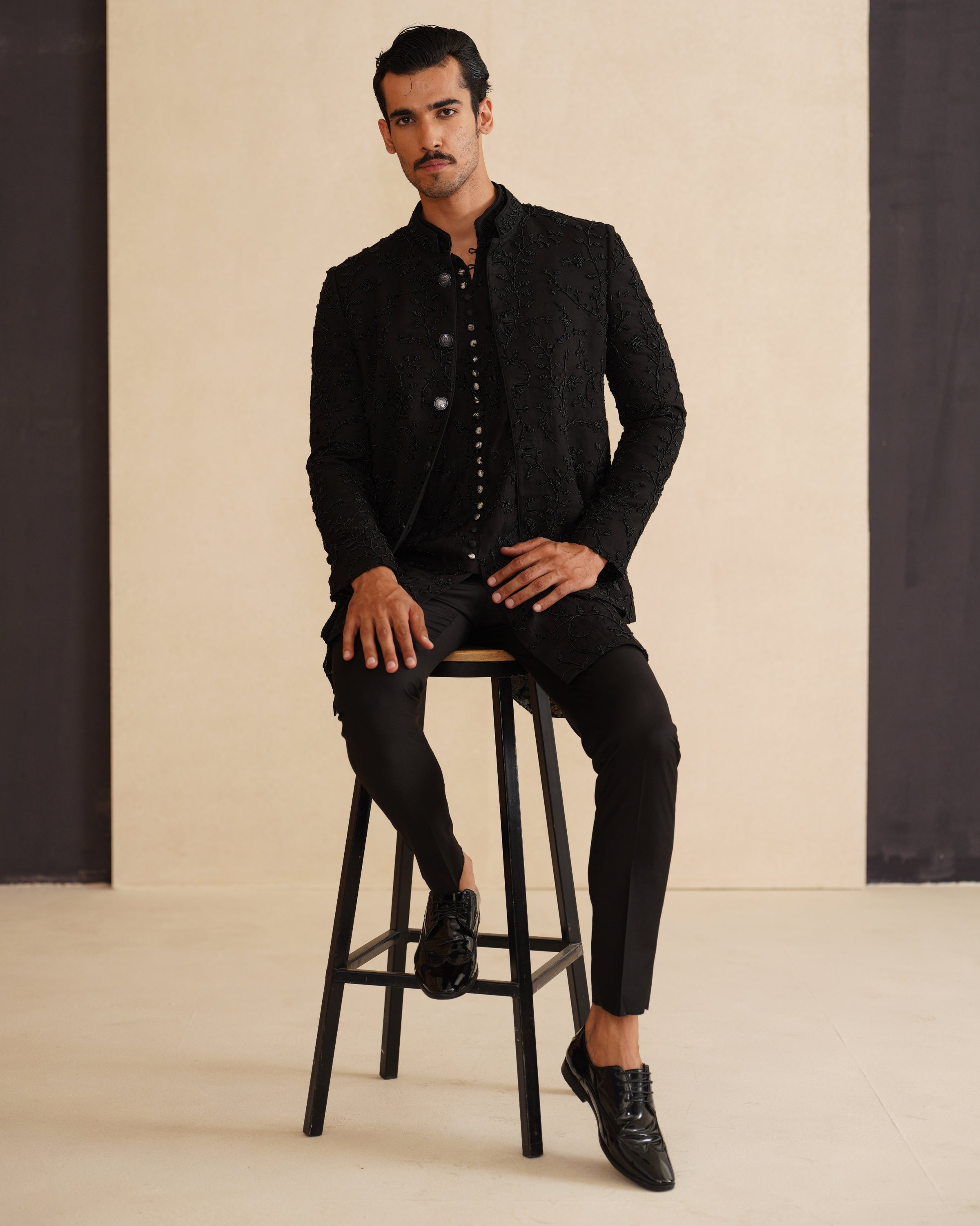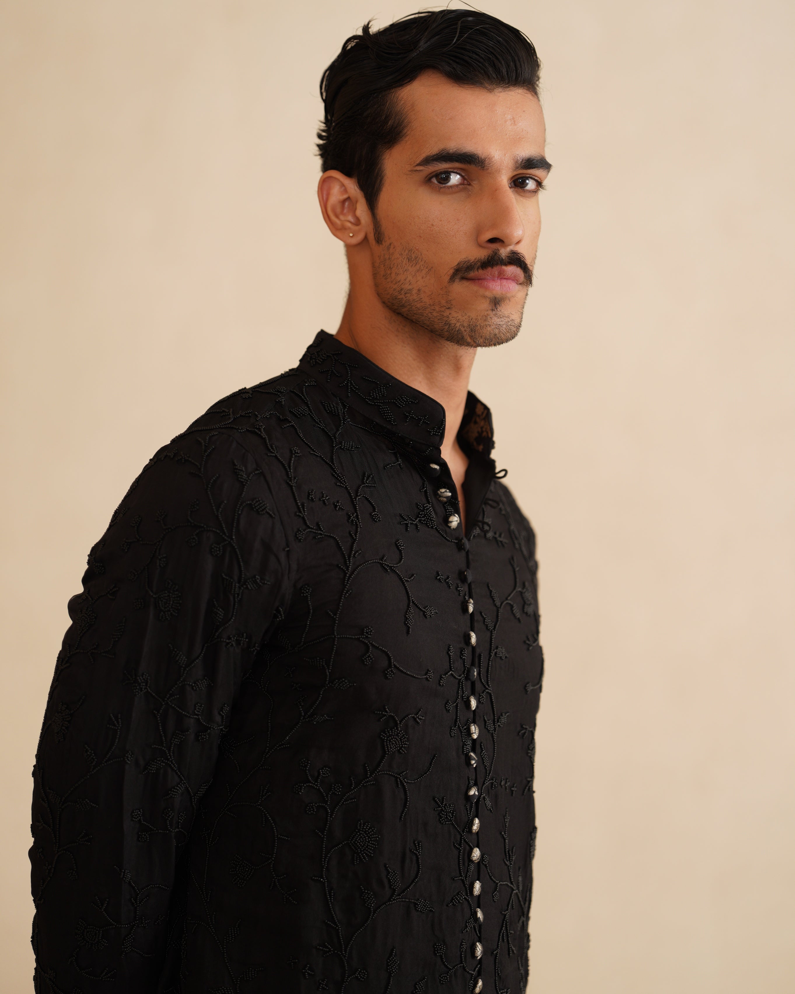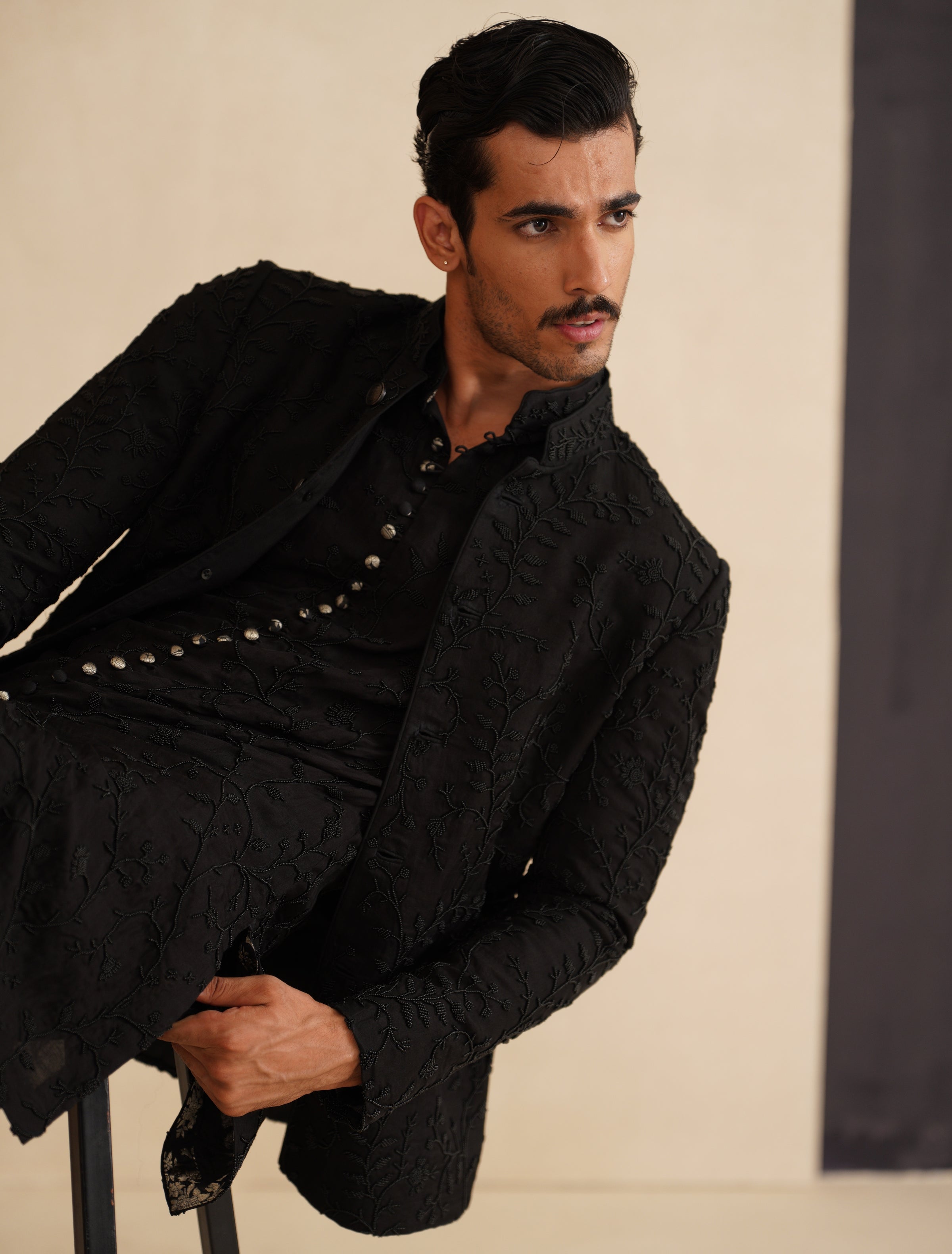 Elevate your wardrobe with the Black banarsi beads bandhgala set, featuring a hand-embroidered bead jacket crafted from sheer pure organza layered over luxurious moga silk for a rich, dimensional look. This sophisticated ensemble includes a matching loopy-button embroidered kurta and classic churi pants, blending traditional craftsmanship with contemporary elegance for a refined statement.