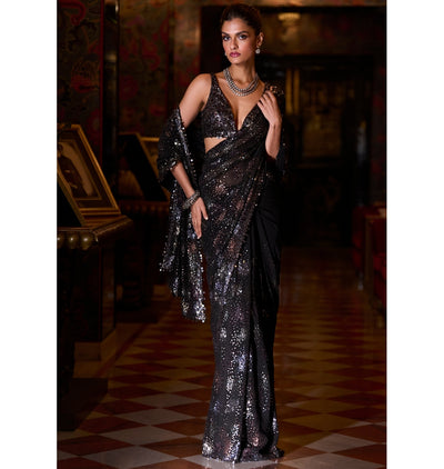 Indulge in luxury with our Black multi-coloured sequin sari. Made from high-quality georgette, this sari boasts intricate metallic sequin clusters all over. Complete the look with the included sequin blouse. Elevate your style and make a statement at any event.