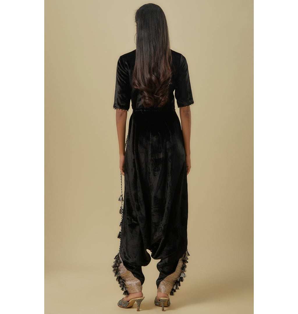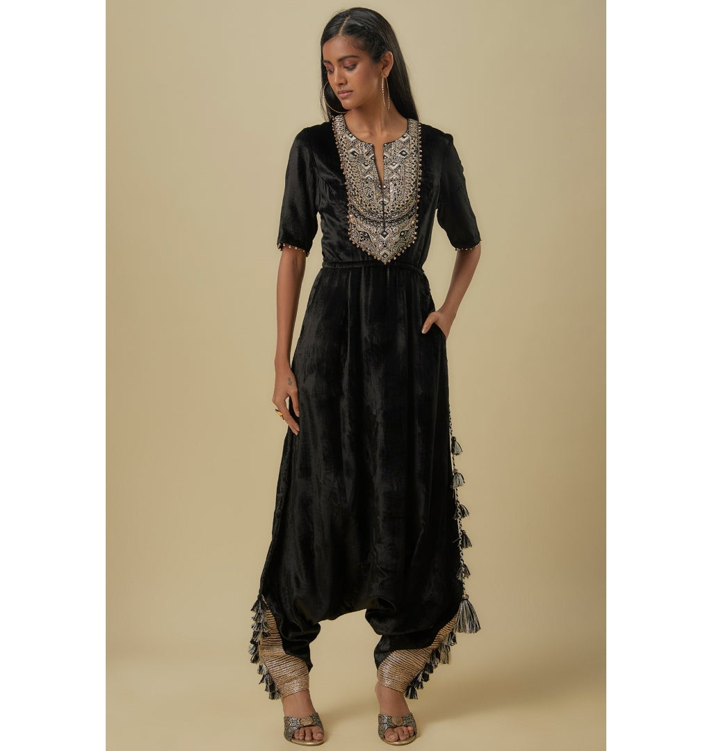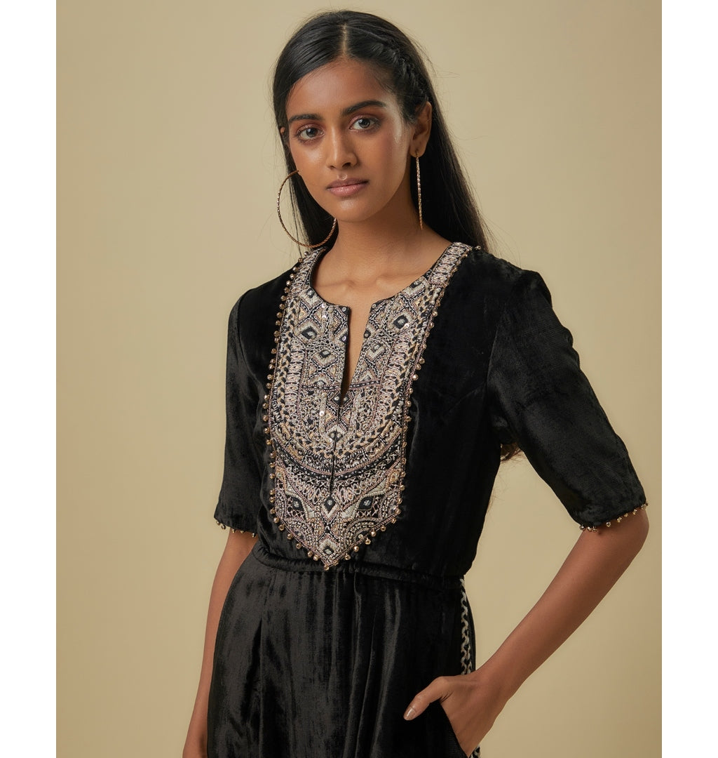 Black Velvet Embroidered Yoke Low Crotch Jumpsuit