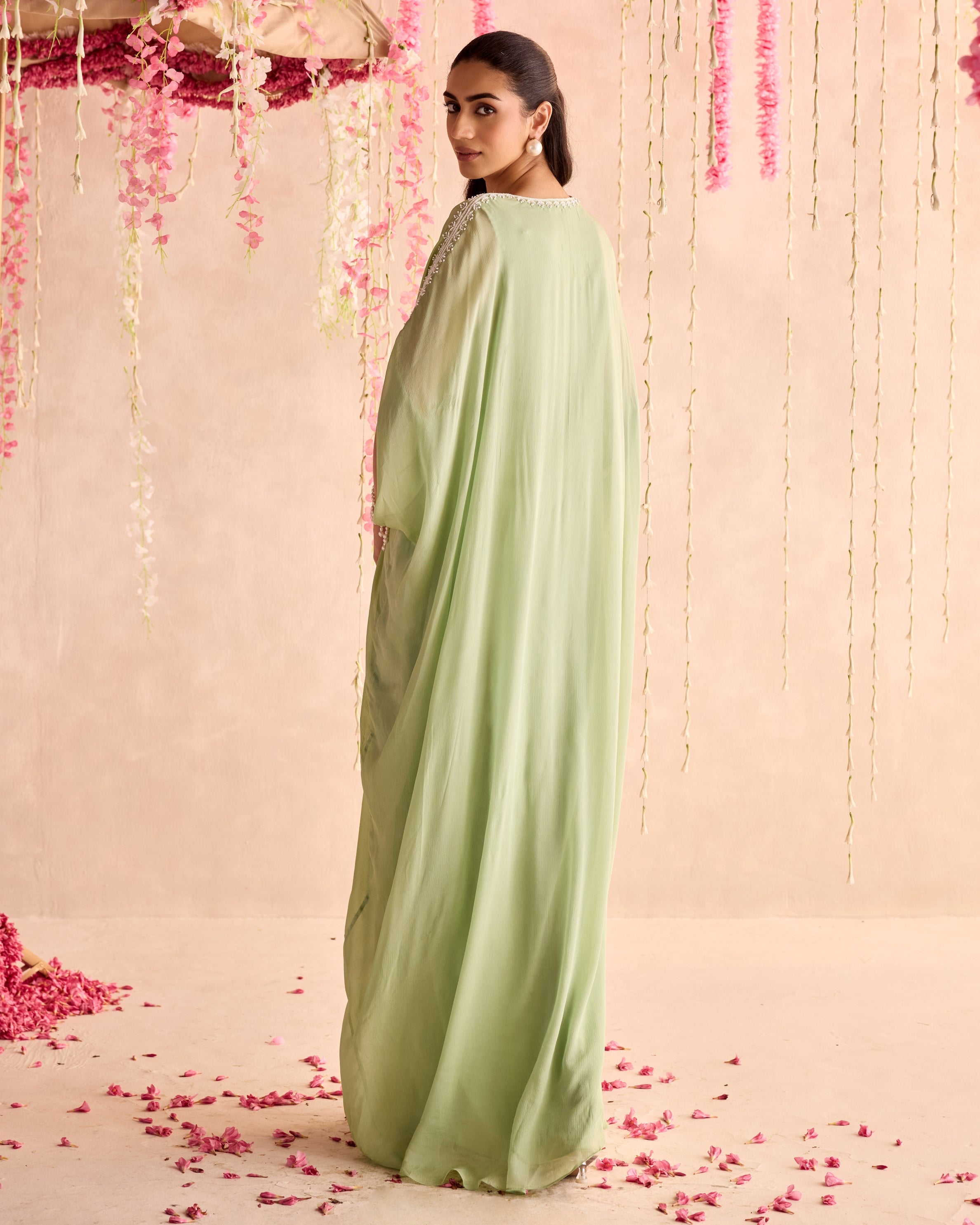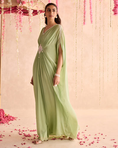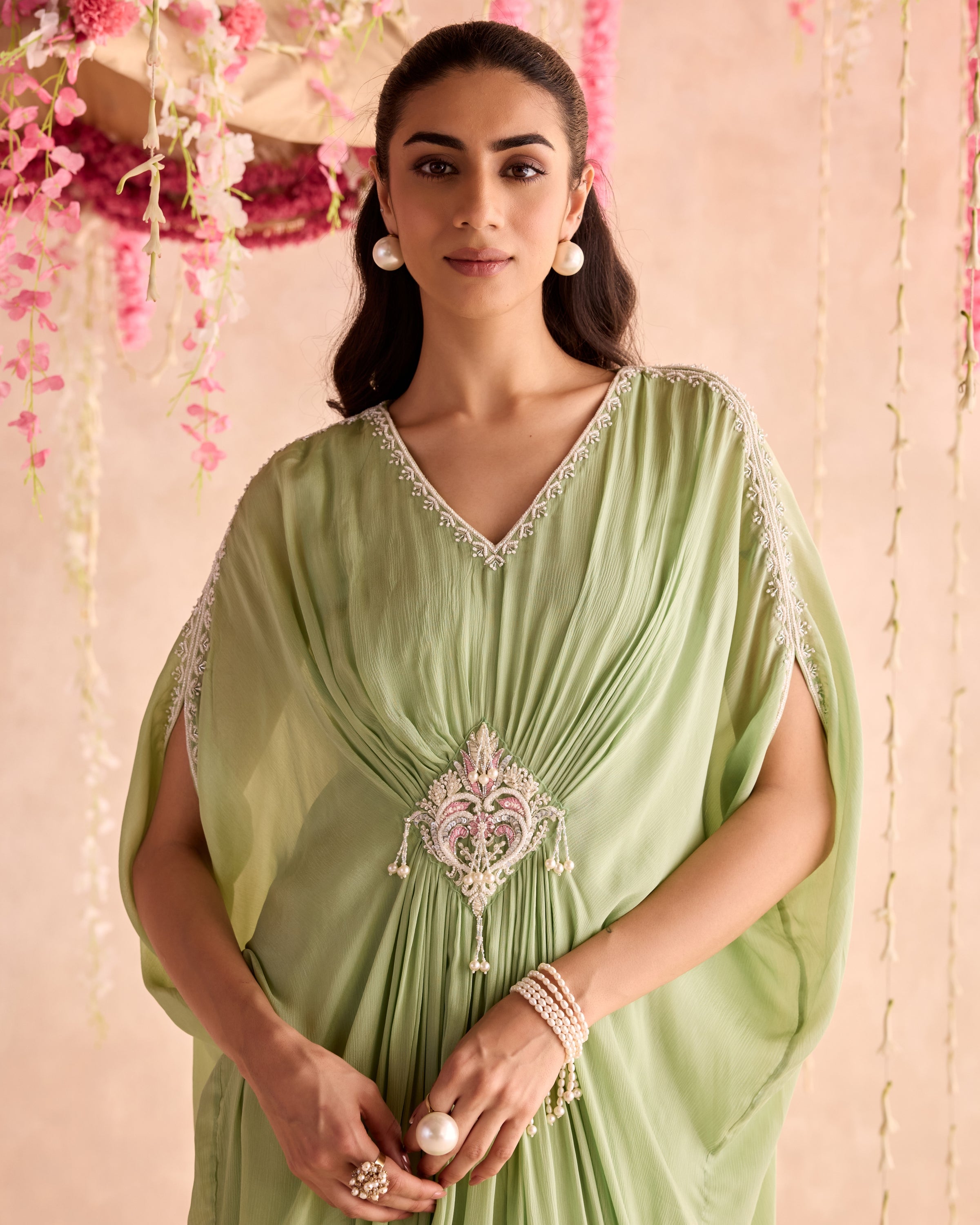The Calla kaftan elegantly combines embellishments and a full length draped design, perfect for any occasion. Expertly crafted with intricate details, this kaftan offers comfort and style in one luxurious piece. Make a statement and elevate your wardrobe with the Calla Kaftan.