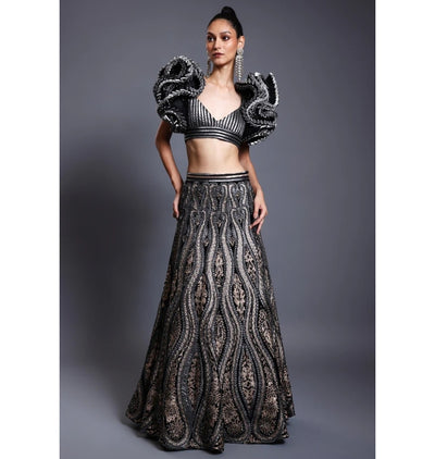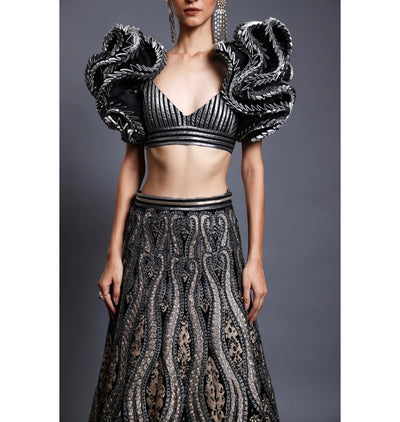 This elegant black and gold skirt set is made with luxurious black velvet and adorned with gunmetal and gold applique, zircons, crystals, and crystal rope embroidery. The blouse features statement ruffled sleeves and strip work embroidery for a unique touch. Perfect for special occasions and formal events.