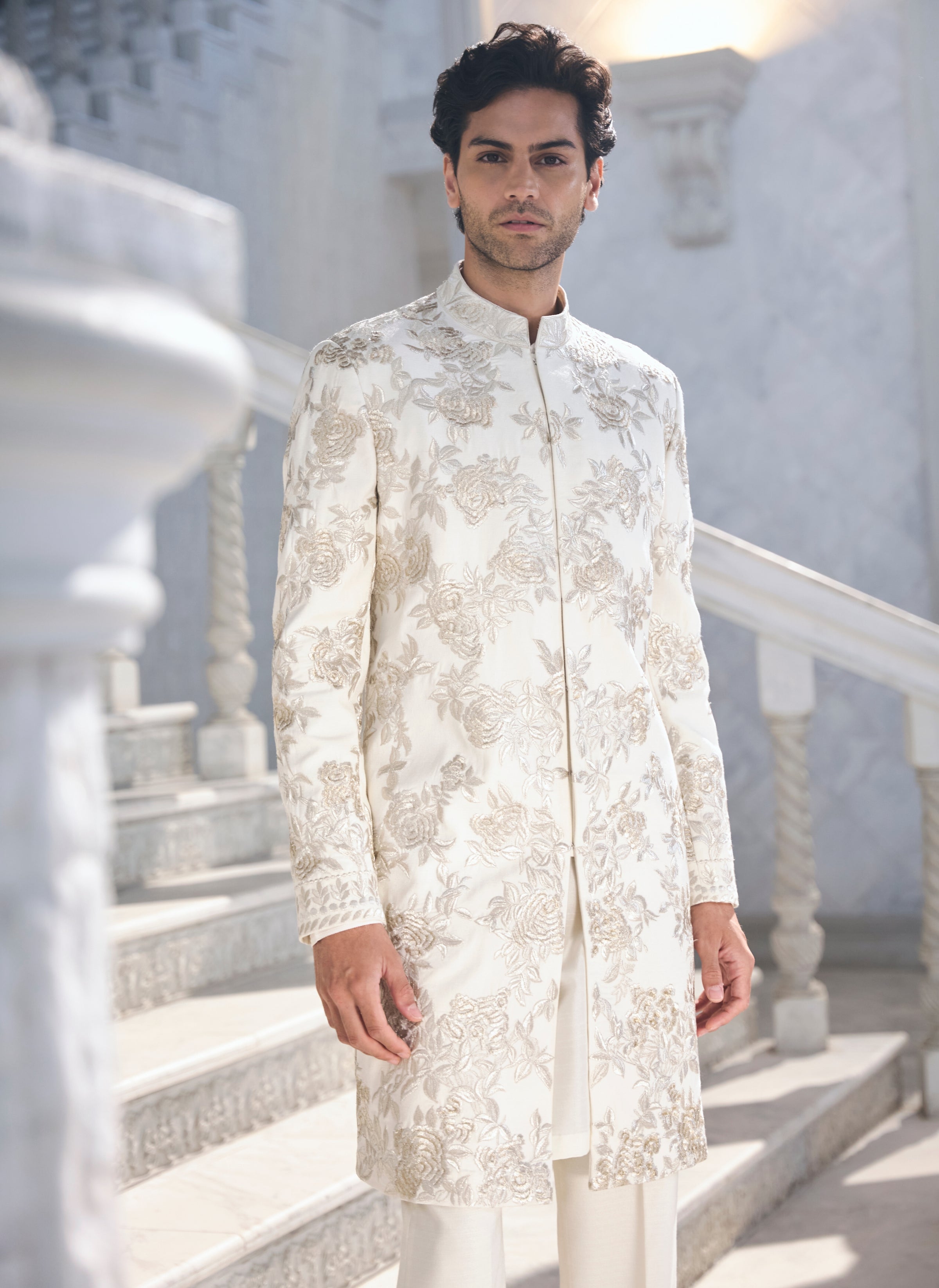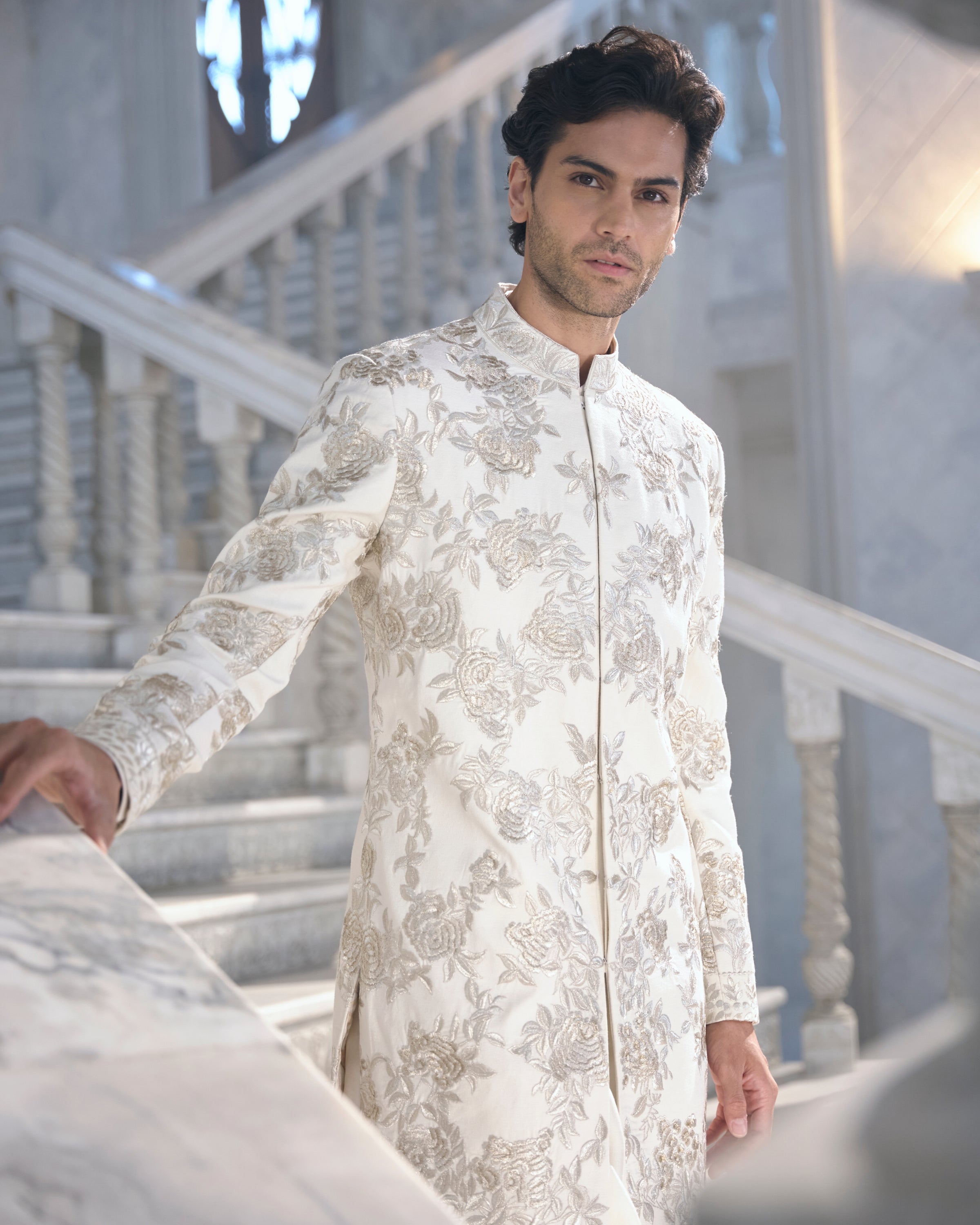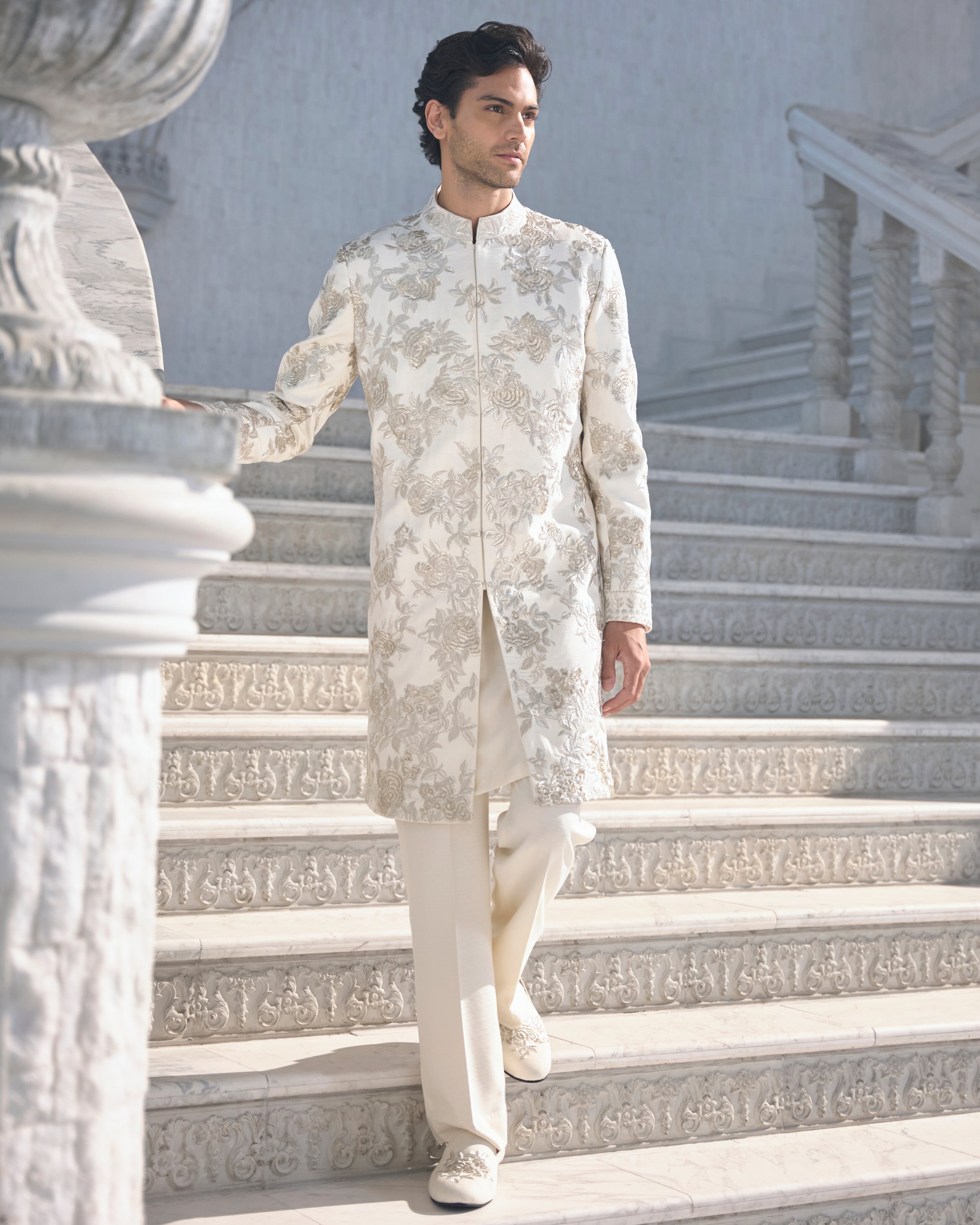 Expertly crafted with zari embroidery on a luxurious ivory matka silk fabric, the Chapelle gold silver sherwani set is a traditional masterpiece. Complete the look with the matching silk kurta, straight pants, and stole. Experience the elegance and sophistication of this exclusive ensemble.