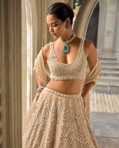 Expertly crafted from nude tissue silk, the Chapelle lehenga set features intricate chandelier inspired pearl and sequin embroidery for a luxurious touch. The matching blouse boasts pearl drops at the waist while the tissue organza dupatta exudes elegance with its embroidered border and delicate pearl detailing.
