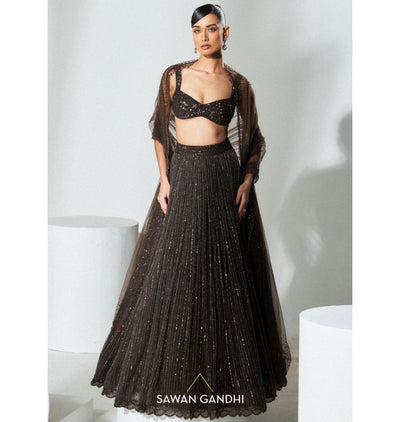 Indulge in refined elegance with our coca brown beadwork lehenga set. The rich coca brown hue is embellished with intricate beadwork, adding a touch of opulence to this net lehenga. The cutwork blouse and net dupatta complete this luxurious ensemble, making it perfect for special occasions.