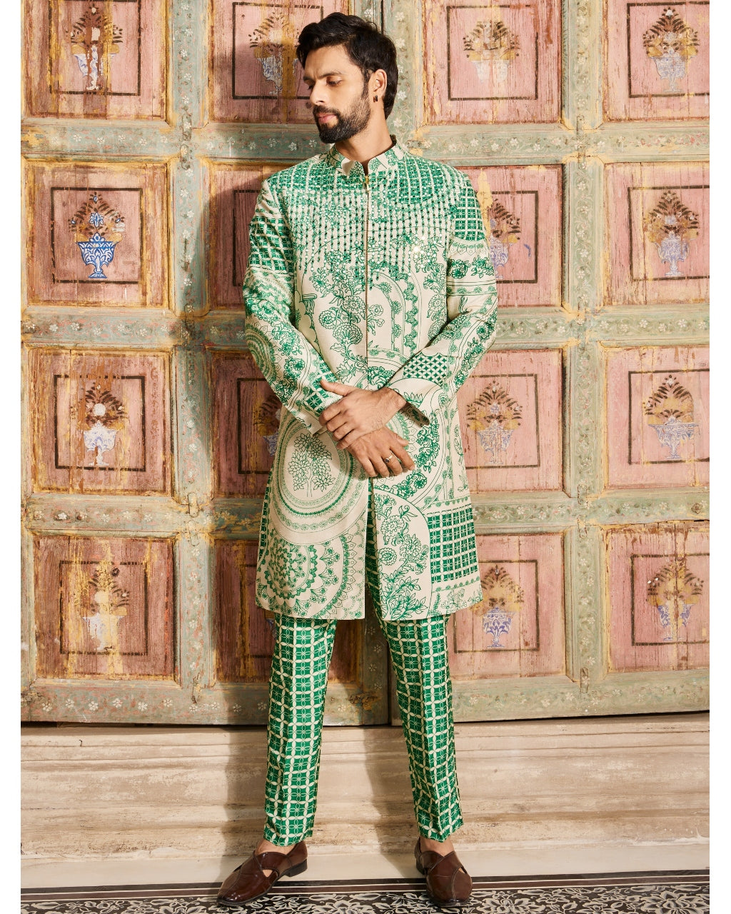 This unique set features a dark green thikri print and highlighted long jacket, paired with dark green grid printed pants. The intricate thikri print adds a touch of elegance, while the highlighted details add a modern twist. Stay stylish and comfortable with this versatile set.