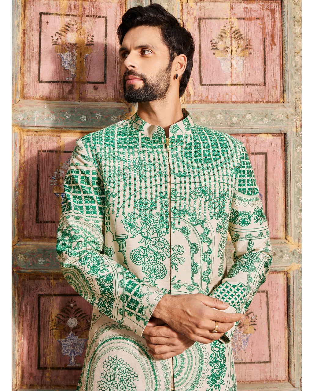 Dark Green Thikri Print and Highlighted Long Jacket Set
