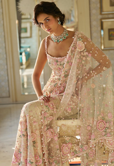 The Fiori nude sharara set features intricate multi-coloured three-dimensional floral embroidery in soft pastel shades, combining delicate sequins and threadwork for a textured, elegant finish. The sleeveless top is detailed with a scalloped hem and subtle tassels, while the matching scalloped dupatta is adorned with pearl tassels on all sides, creating a refined and graceful ensemble perfect for sophisticated occasions.