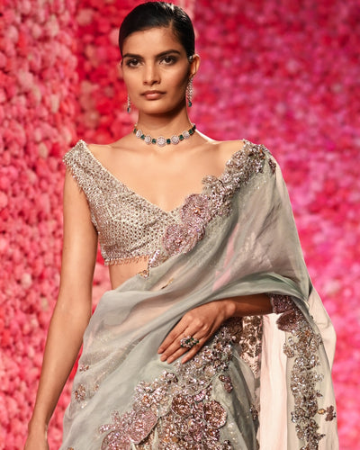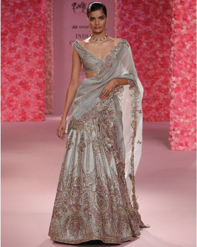 Exude elegance in this exquisite Gabrielle lehenga set. Crafted from powdery sage raw silk, this heavy bridal lehenga set features intricate thread work for a luxurious touch. The heavily encrusted choli and organza dupatta elevate the look, making it perfect for a special occasion.