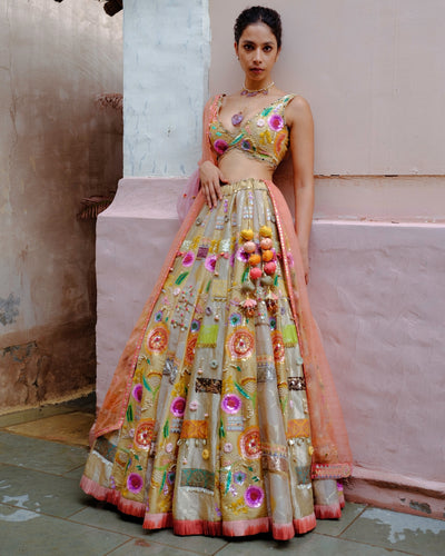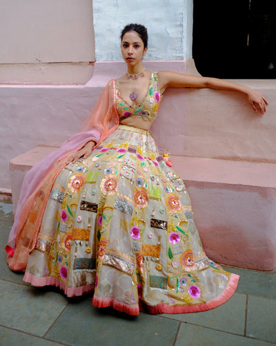 This Gold sequins lehenga set boasts intricate and colourful embellishments all over, creating a dazzling effect. Its top-notch craftsmanship extends to the blouse and organza dupatta for a complete look. Make a statement at any celebratory occasion with this stunning set.