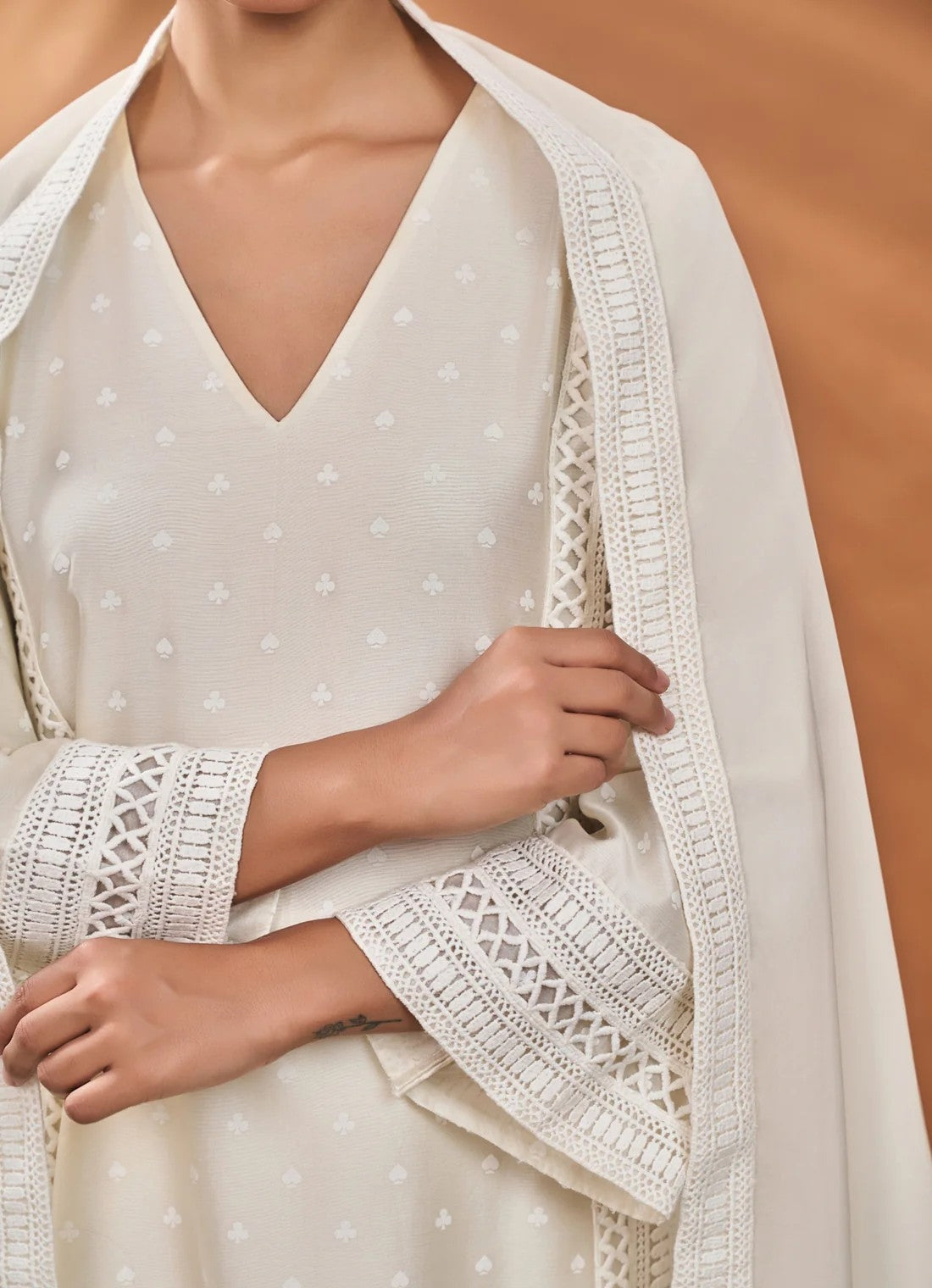 Expertly crafted with luxurious khadi fabric, the Ivory all fours kurta set is the epitome of elegance and sophistication. The all-over print and embellished details on the sleeves and neckline add a touch of style. Complete the look with the organza dupatta, adorned with placement prints and delicate crochet borders.