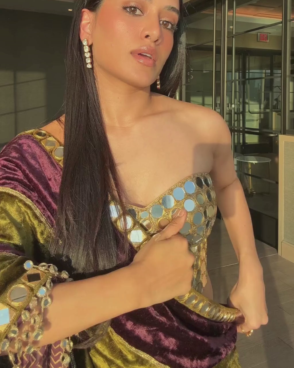 Experience the beauty of traditional Indian fashion with our jahan-e-ishq sari set. Crafted with luxurious velvet fabric, this sari features a stunning color block pattern in olive and purple, adorned with intricate mirror work and tassel details on the border. Complete your look with the matching blouse for an elegant and timeless ensemble.