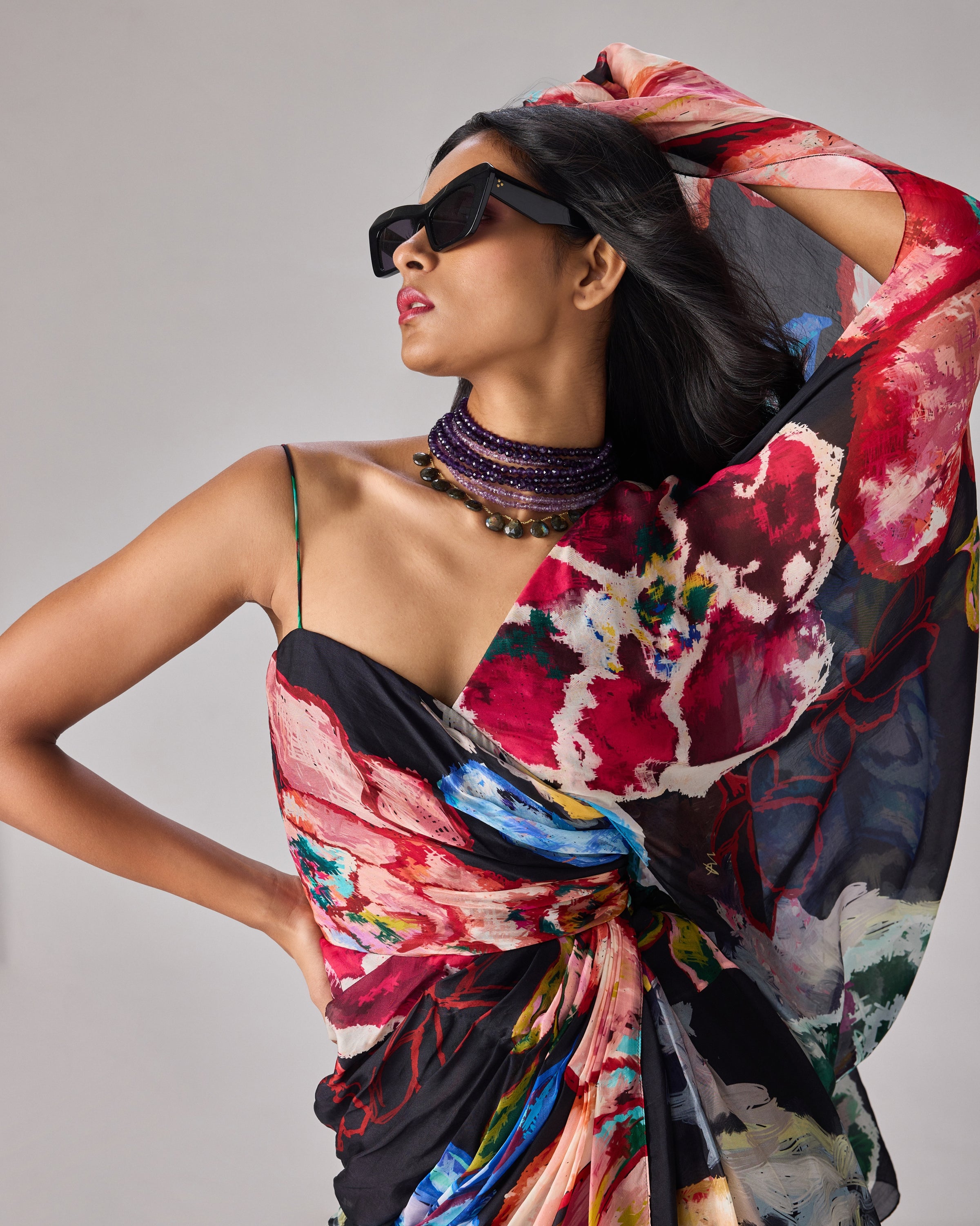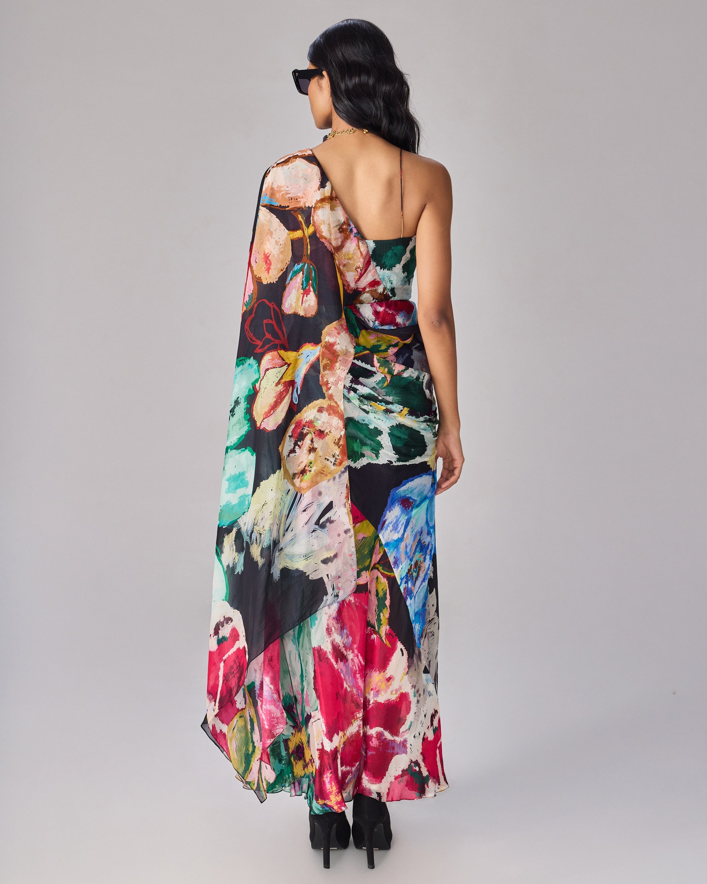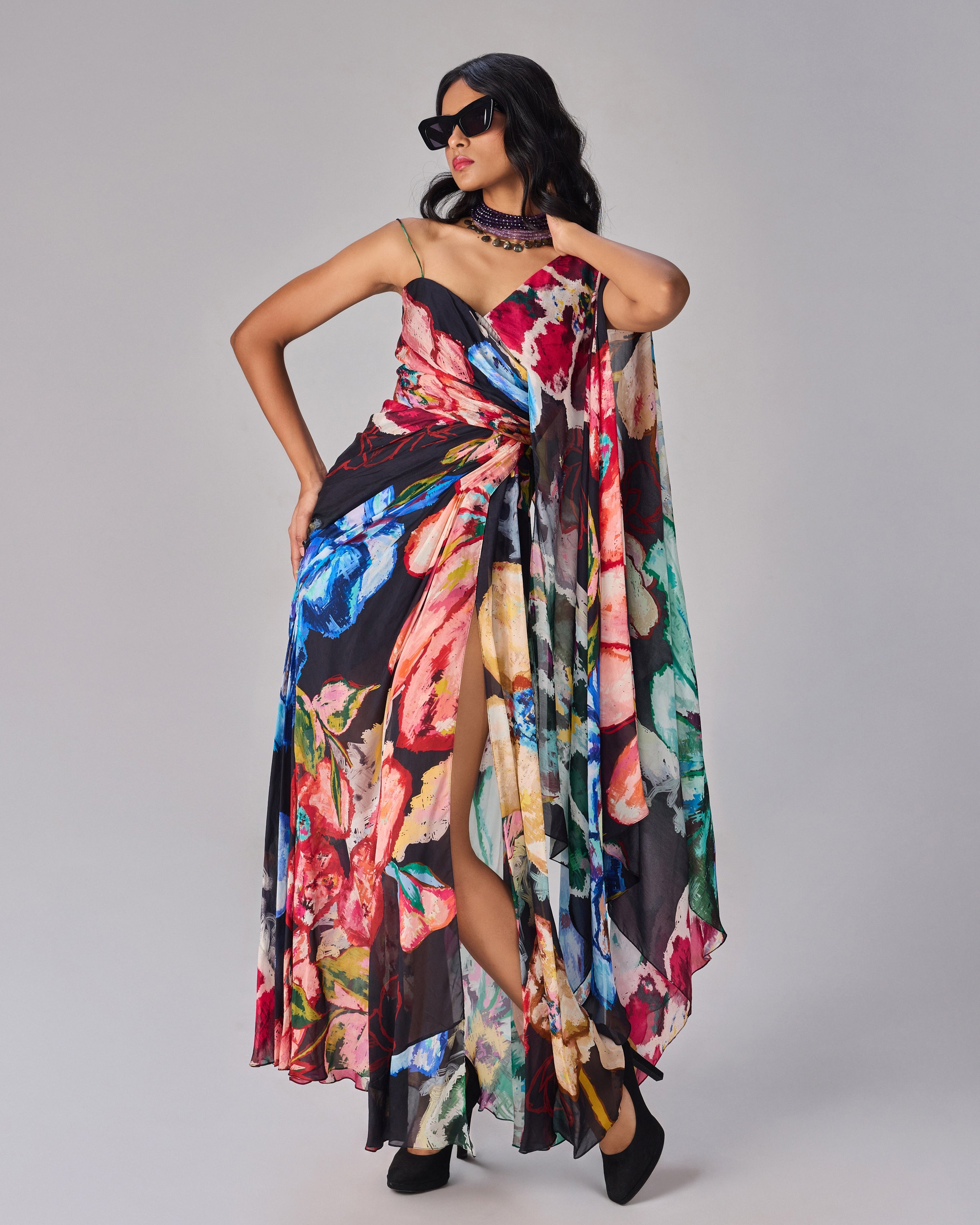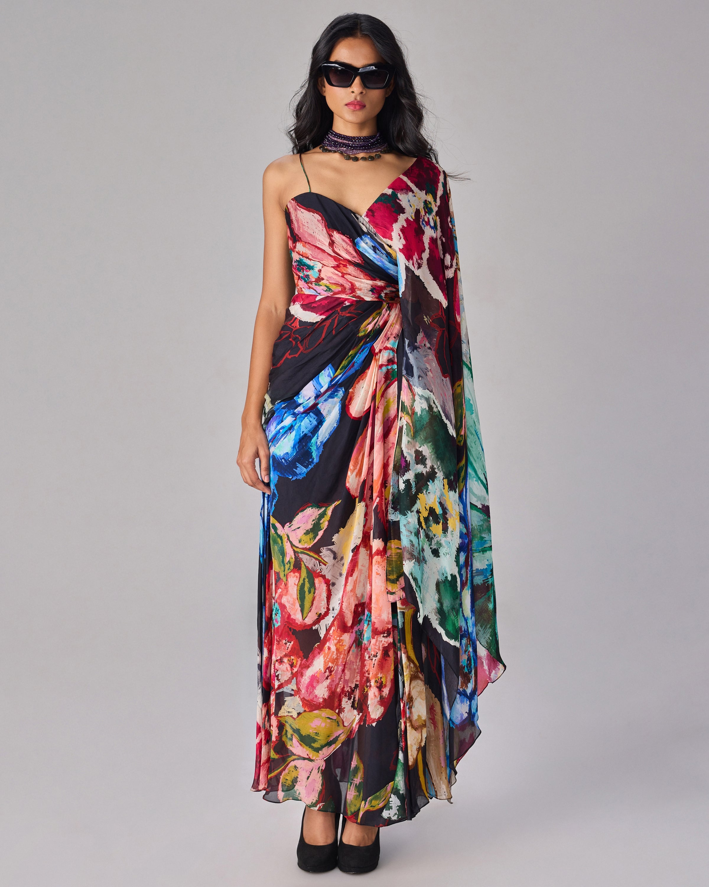 Introducing the Karisma dress - a must-have for any fashion-forward individual. This stunning dress features a bold floral print, an asymmetric design with a pleated bodice, and elegant contrast noodle straps. The draped shoulder detailing adds a touch of sophistication to this versatile piece. Elevate your style game with the Karisma dress.