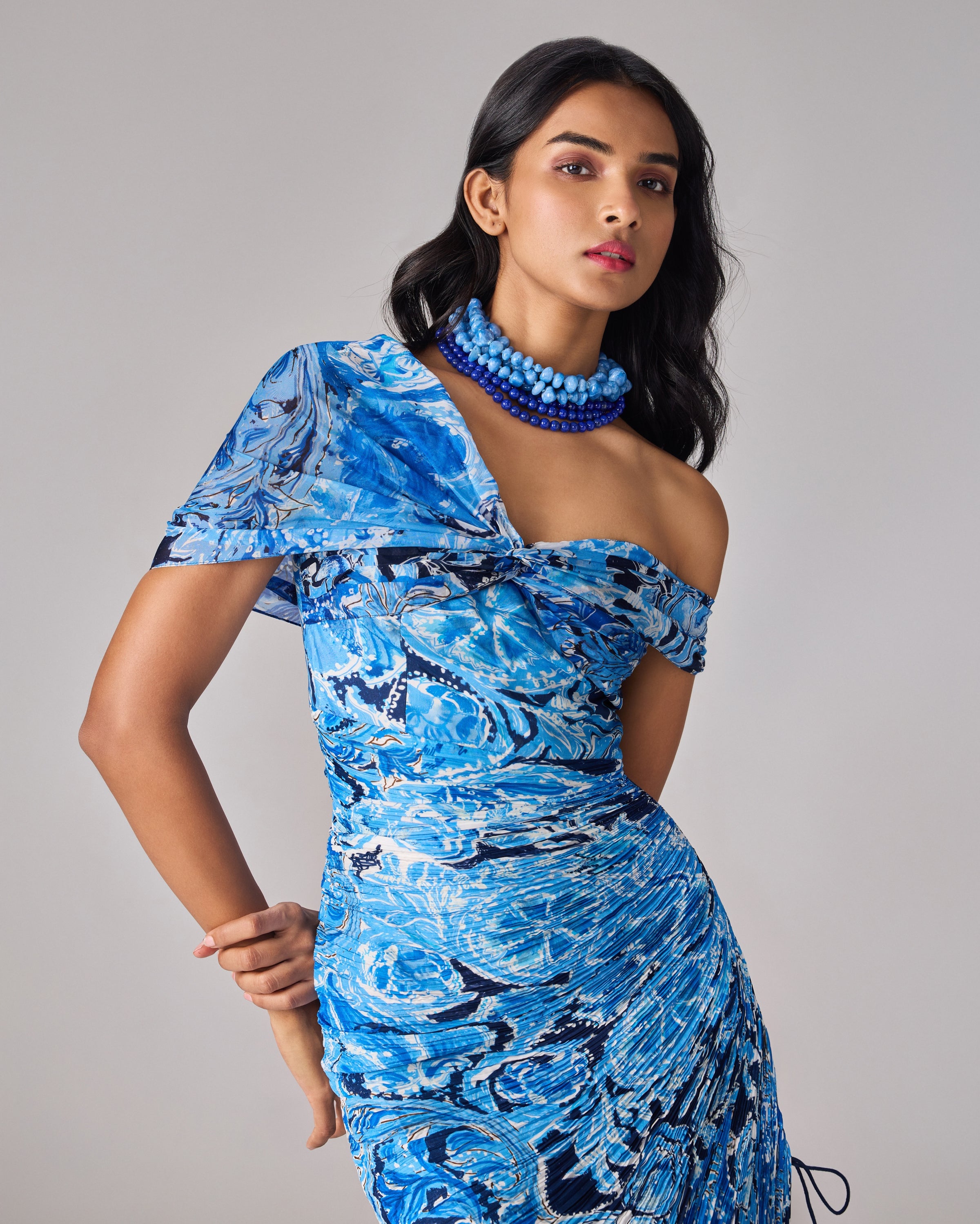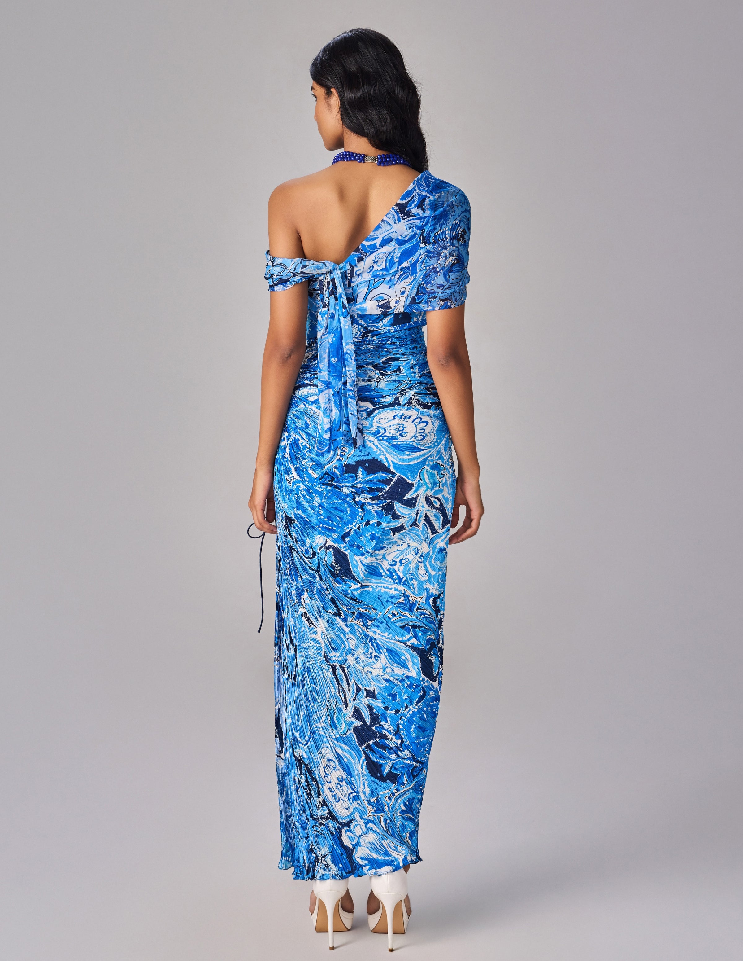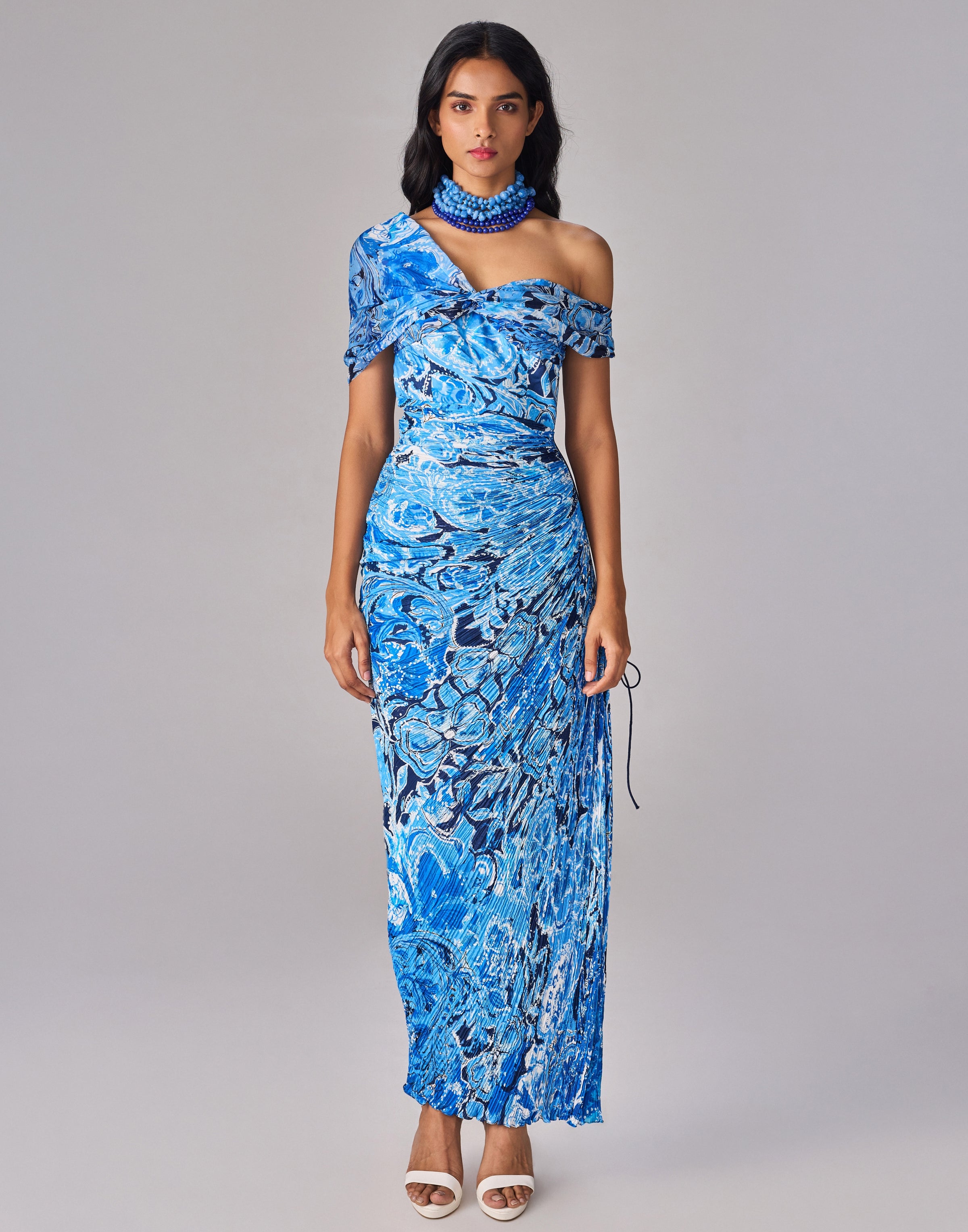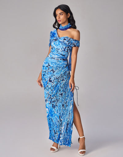 Showcase your style with the Leena dress. This elegant maxi dress features a stunning abstract floral print and draped overlap off shoulder sleeves for a unique look. The hand micro pleat detailing adds texture and visual interest, while the adjustable drawstring side slit allows for a customizable fit. Stay on trend and make a statement with the Leena Dress.