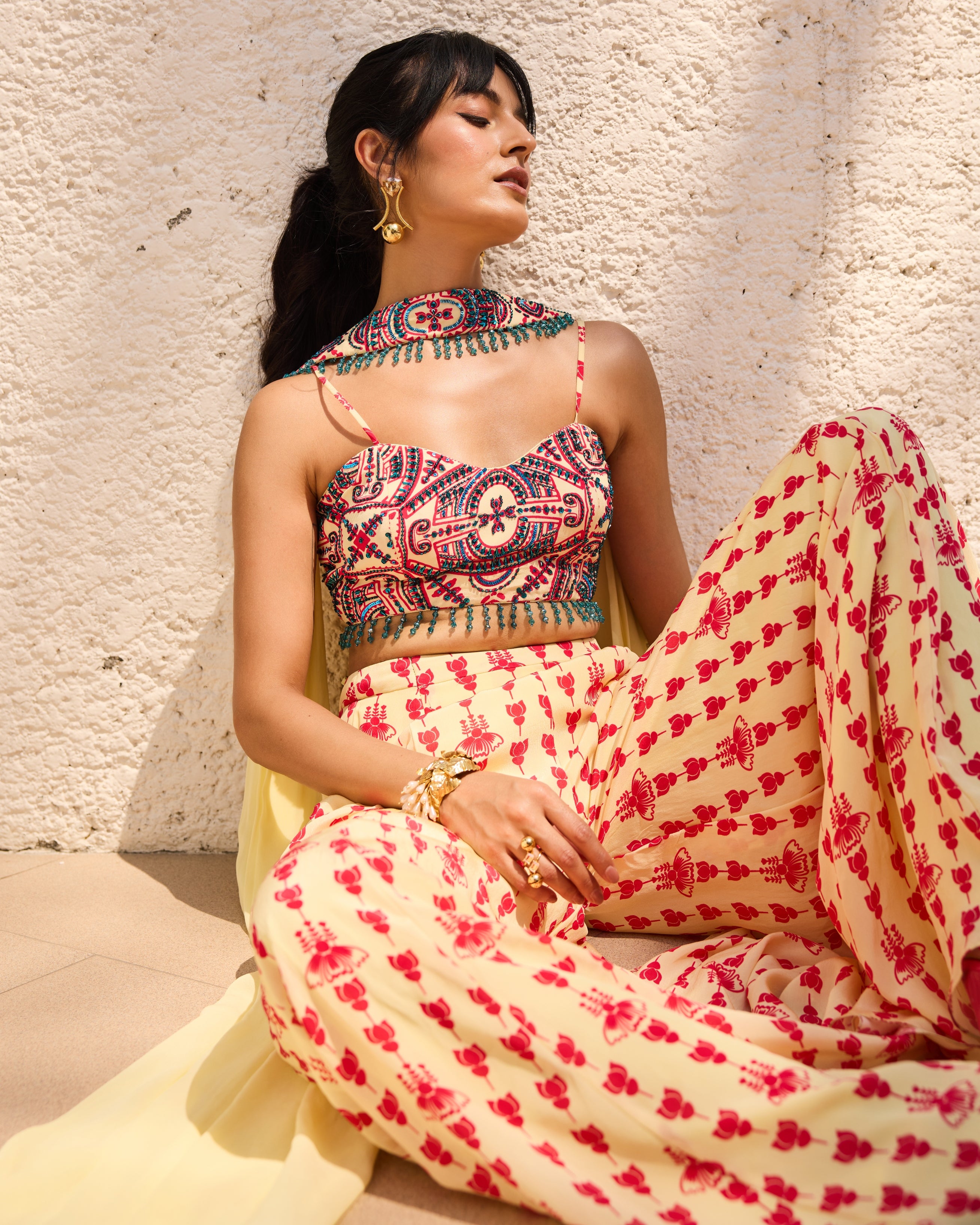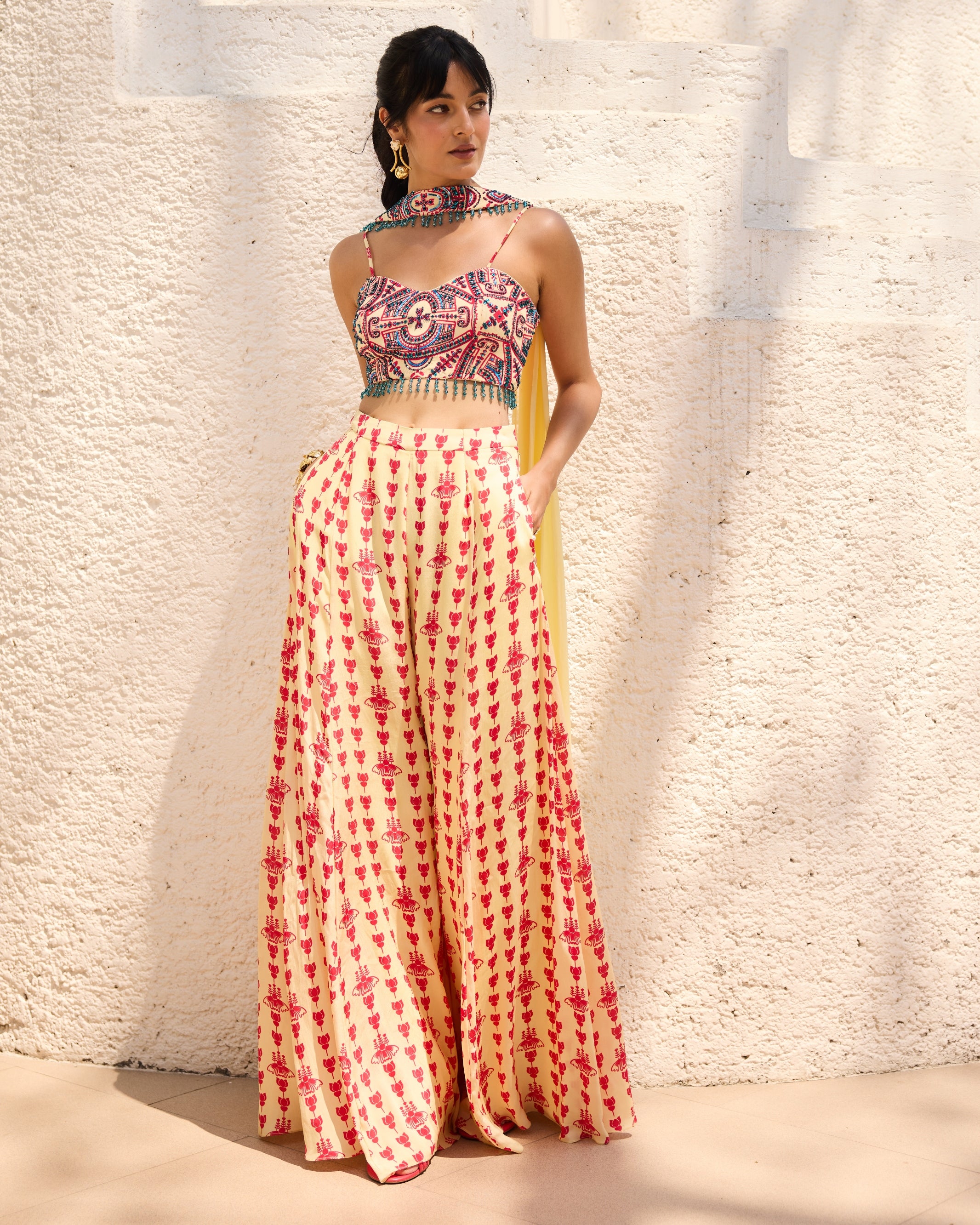 Achieve a bold and modern look with our Liraspaih panelled yellow printed crop top set. The vibrant yellow asymmetric print and highlighted crop top perfectly complements the panelled pants and choker dupatta. Make a statement with this stylish and unique set.