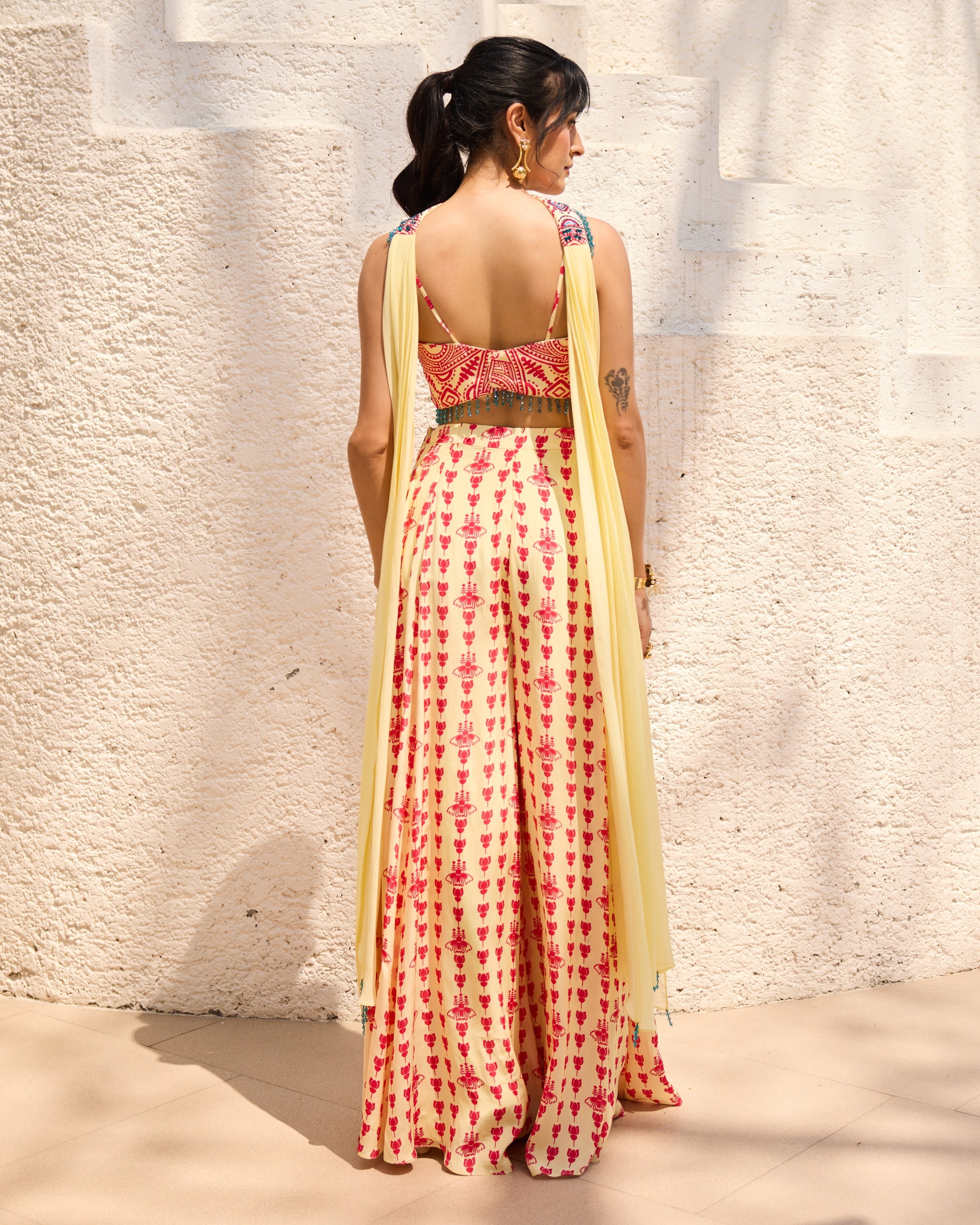 Liraspaih Panelled Yellow Printed Crop Top Set