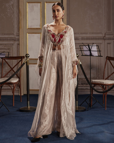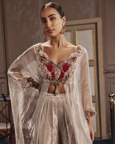 Elevate any occasion with the Lumina kurta set. The shimmering silver and red embellishments on the neckline, accented with intricate cutwork, exude luxury and sophistication. Paired with tissue foil flared palazzos that resemble molten silver, this ensemble will leave a lasting impression. Kurta and palazzo are both meticulously crafted for a truly exclusive experience.