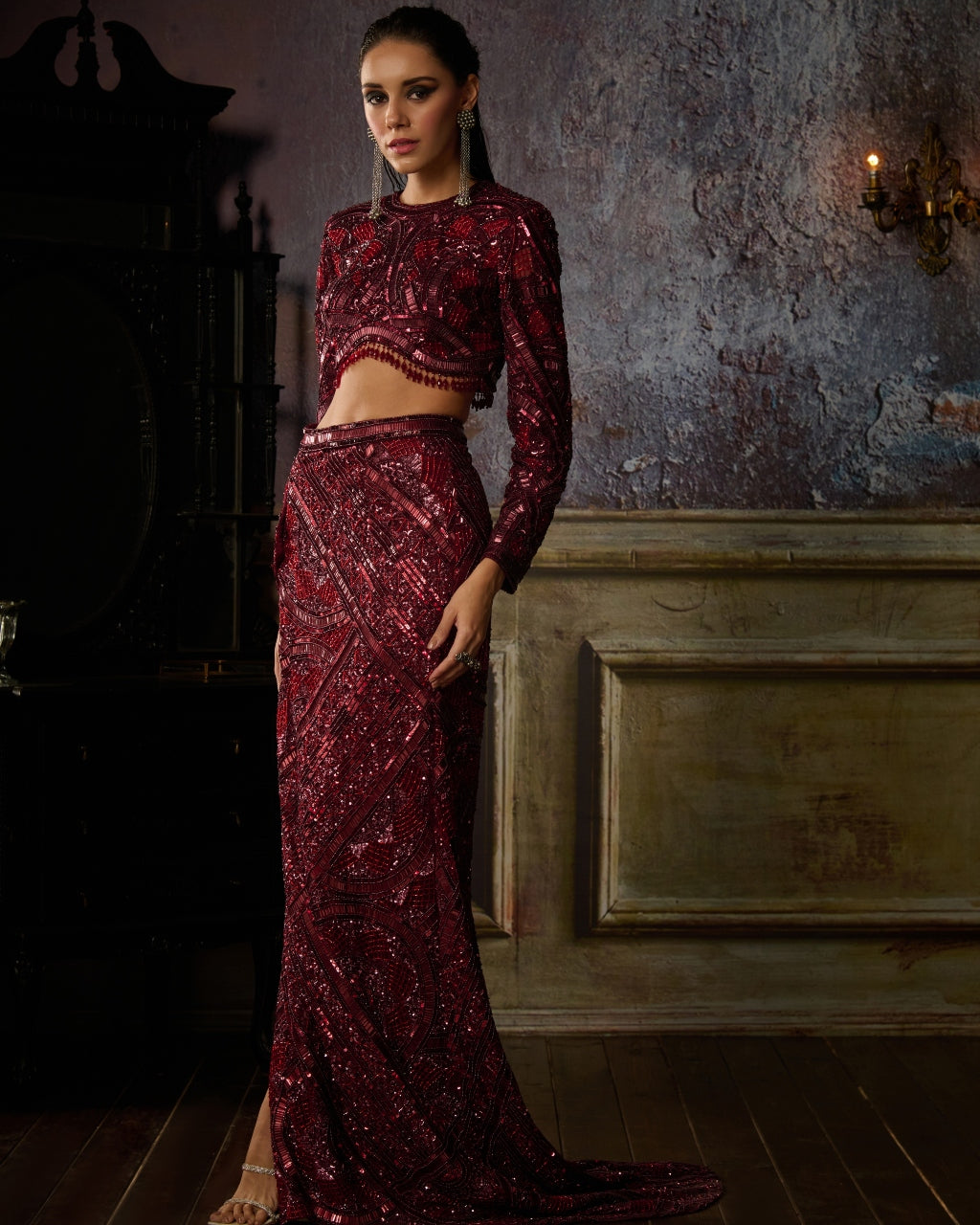 Maroon Fully Embroidered Blouse And Slit Trail Skirt