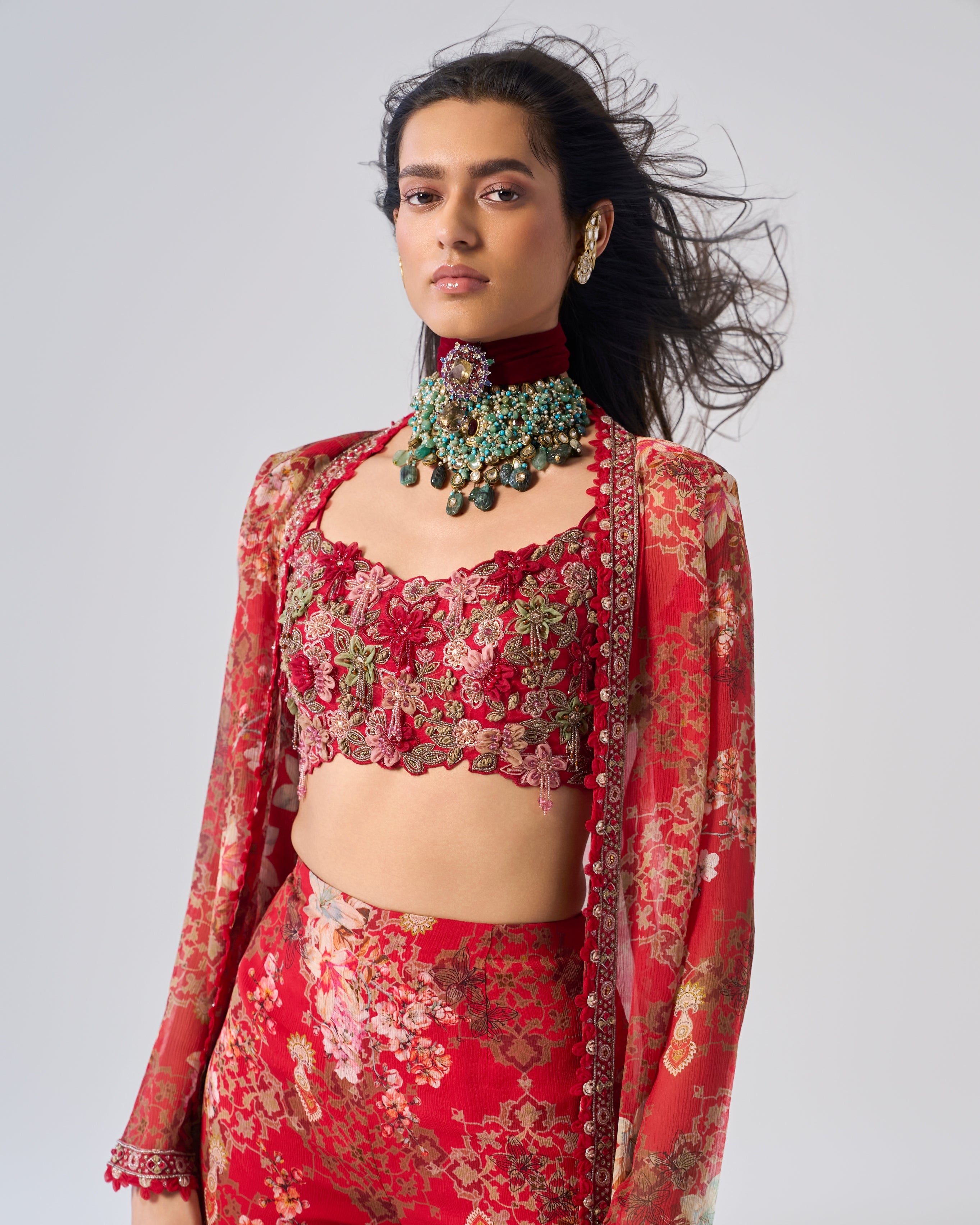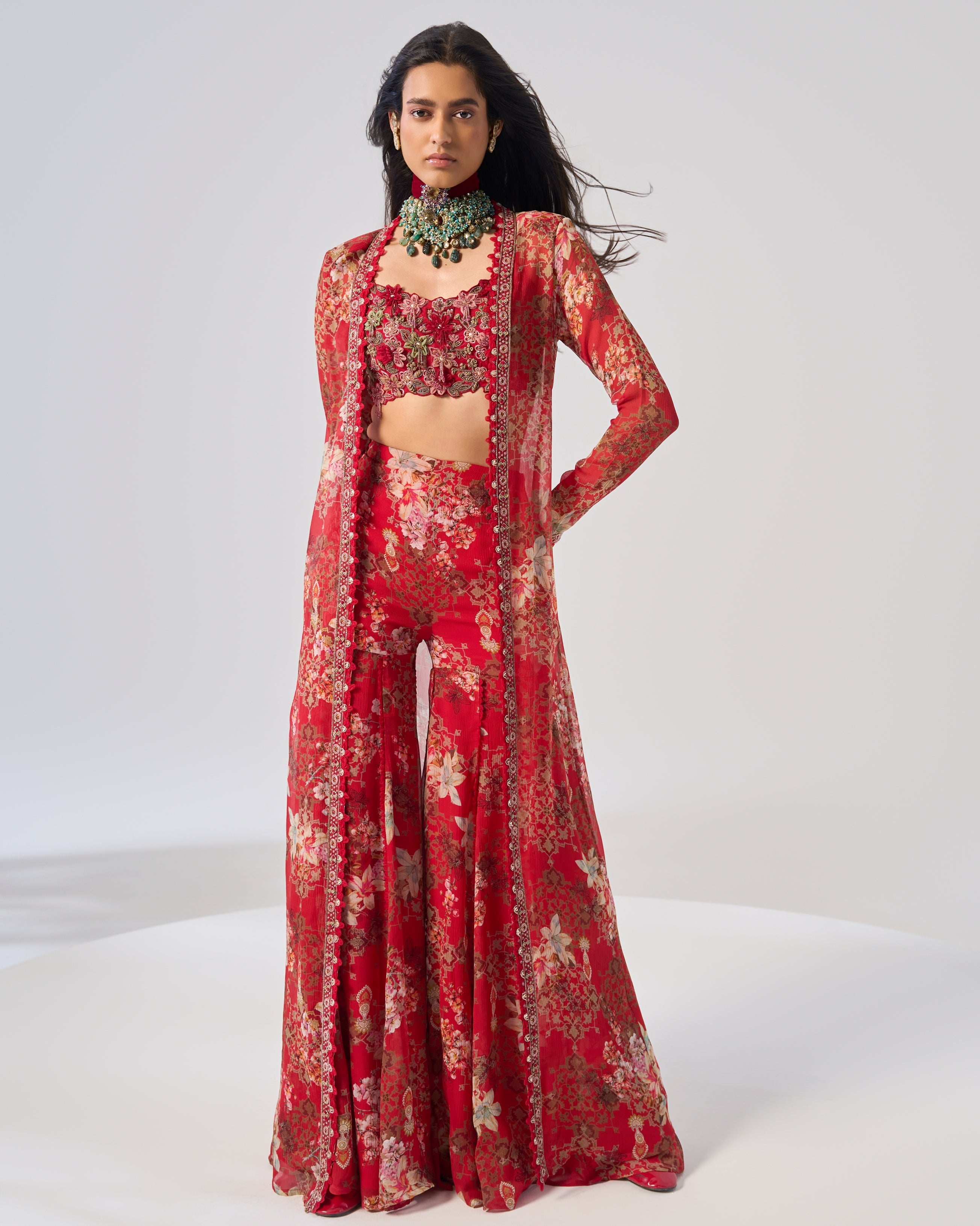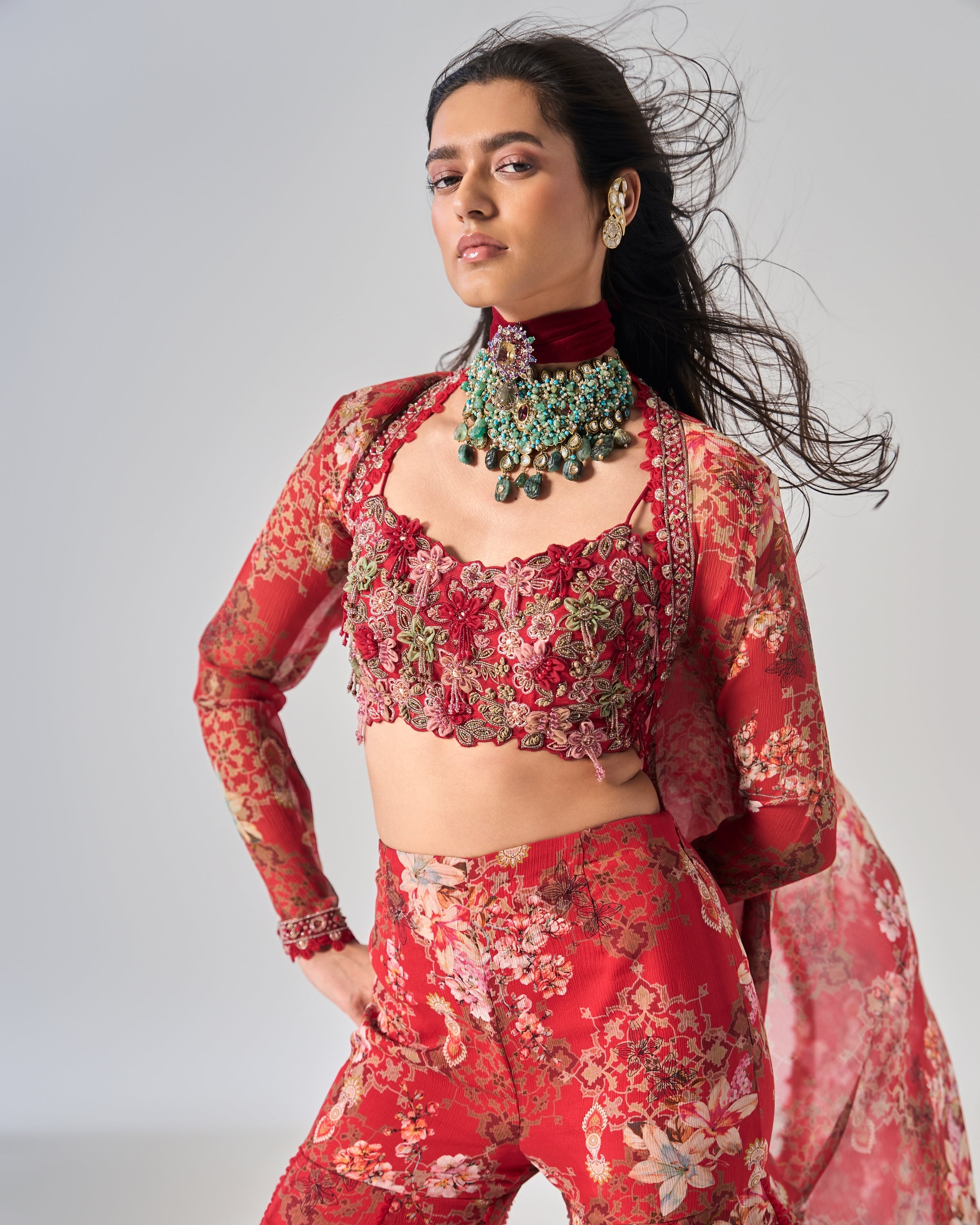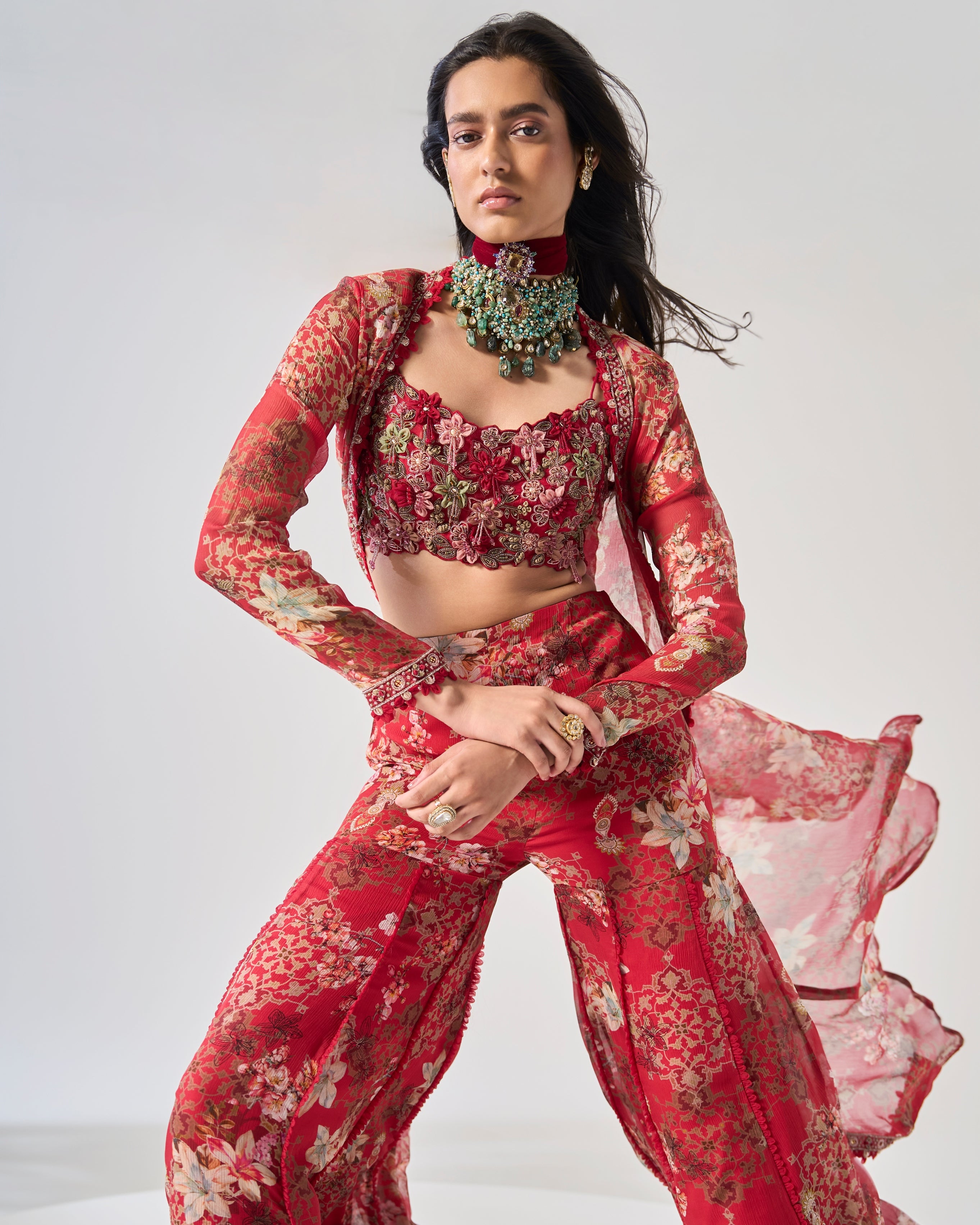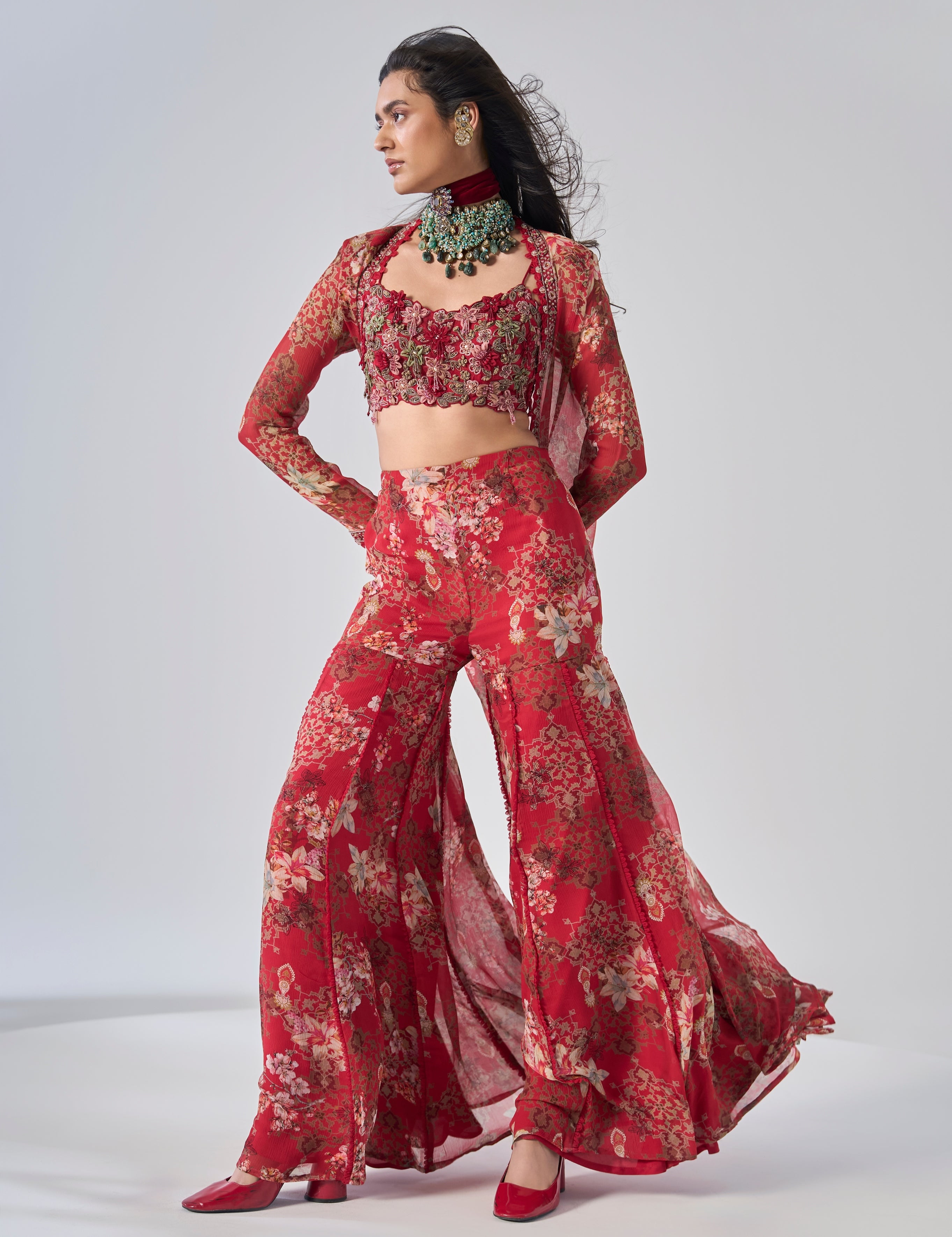 This contemporary three-piece floral set features a bustier with delicate floral embroidery, paired with flowy, high-waisted sharara pants that offer a breezy, feminine silhouette. The look is elevated by a matching long sheer jacket, detailed with scalloped edges and intricate embellishments. Crafted in lightweight chiffon with floral motifs, this ensemble blends elegance with modern flair—perfect for mehendi festive soirées.