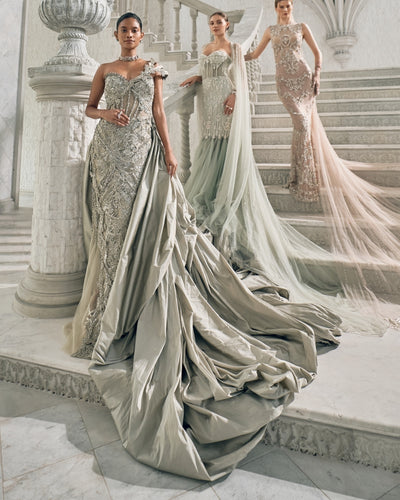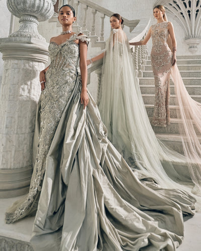 This elegant Mint crush gown features exquisite zardozi embroidery all over, crafted from high quality imported net fabric. Perfect for a cocktail event, this gown offers the perfect blend of style and comfort. Elevate your look with this stunning piece.
