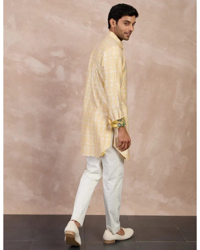 Elevate your look with our Mustard yellow maze foe kurta set. Made with luxurious chanderi silk and inara viscose, this set boasts intricate prints on the cuff, collar, chalk, and hem. Complete with a matching churi pants, this elegant ensemble is perfect for any occasion. Experience timeless style and comfort.