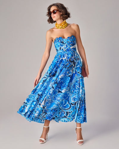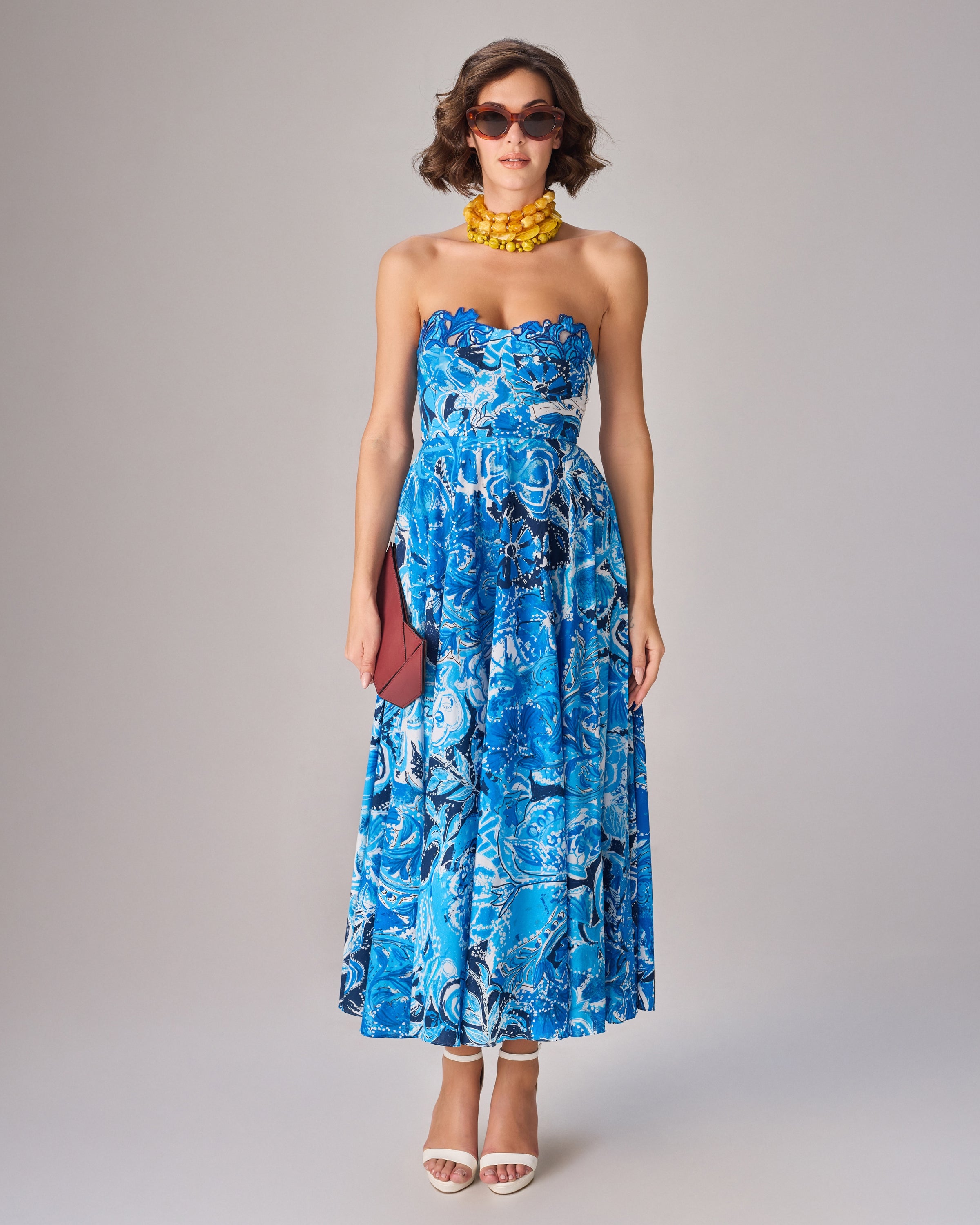 Discover the perfect blend of elegance and modernity with our Myra dress. Featuring an abstract floral print, this strapless and pleated midi dress is accentuated by a beautiful cut work embroidered neckline. Elevate your style with this sophisticated piece.