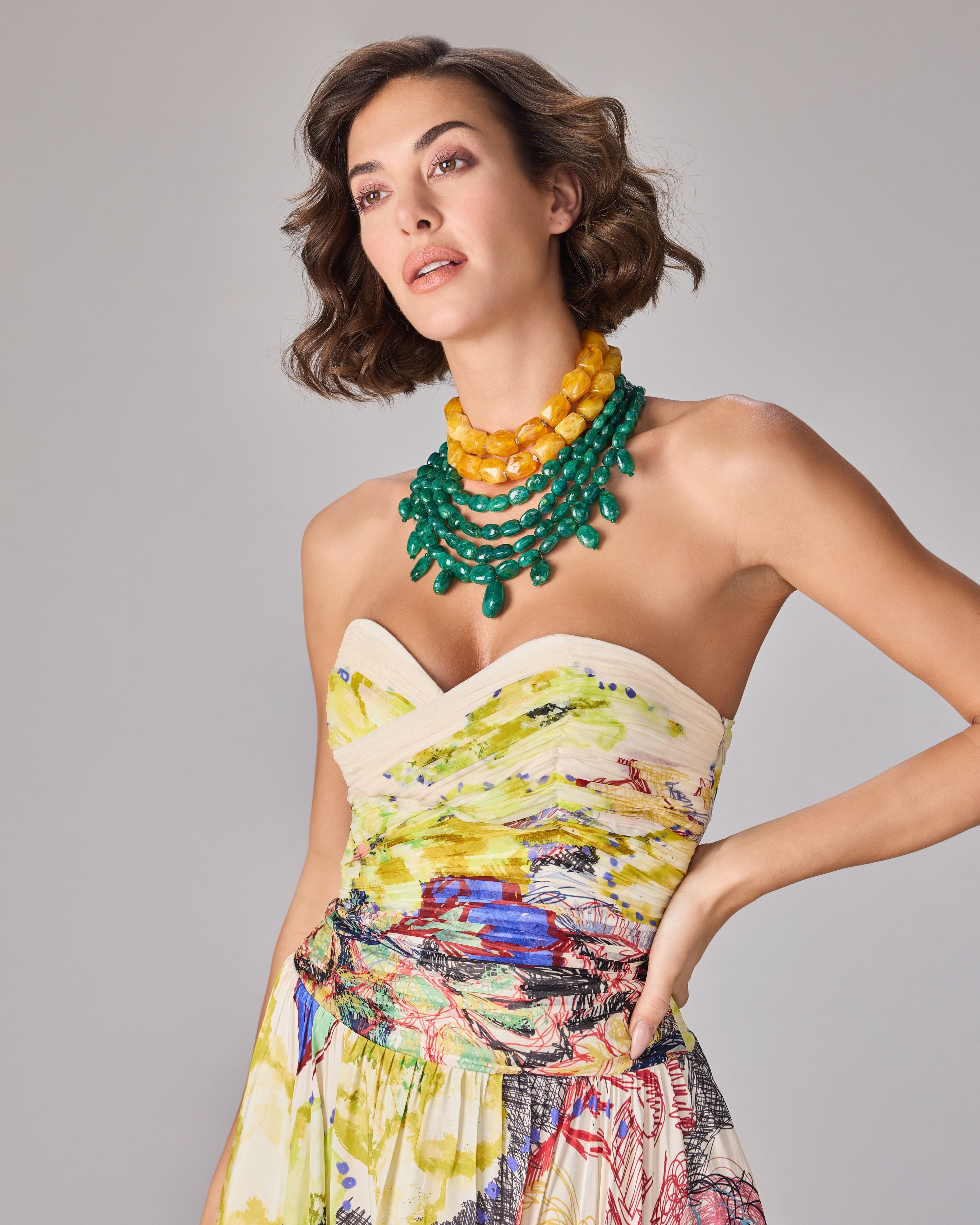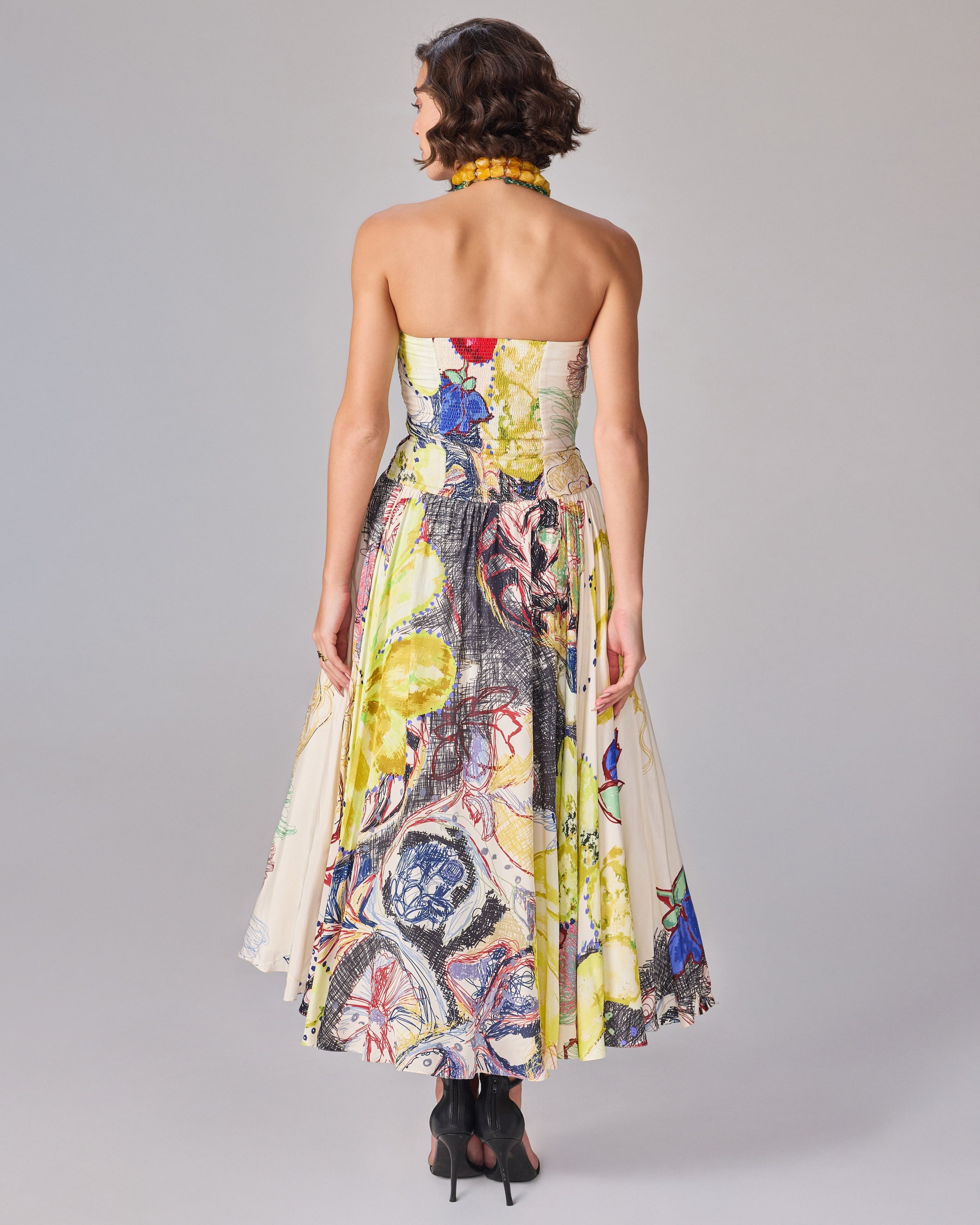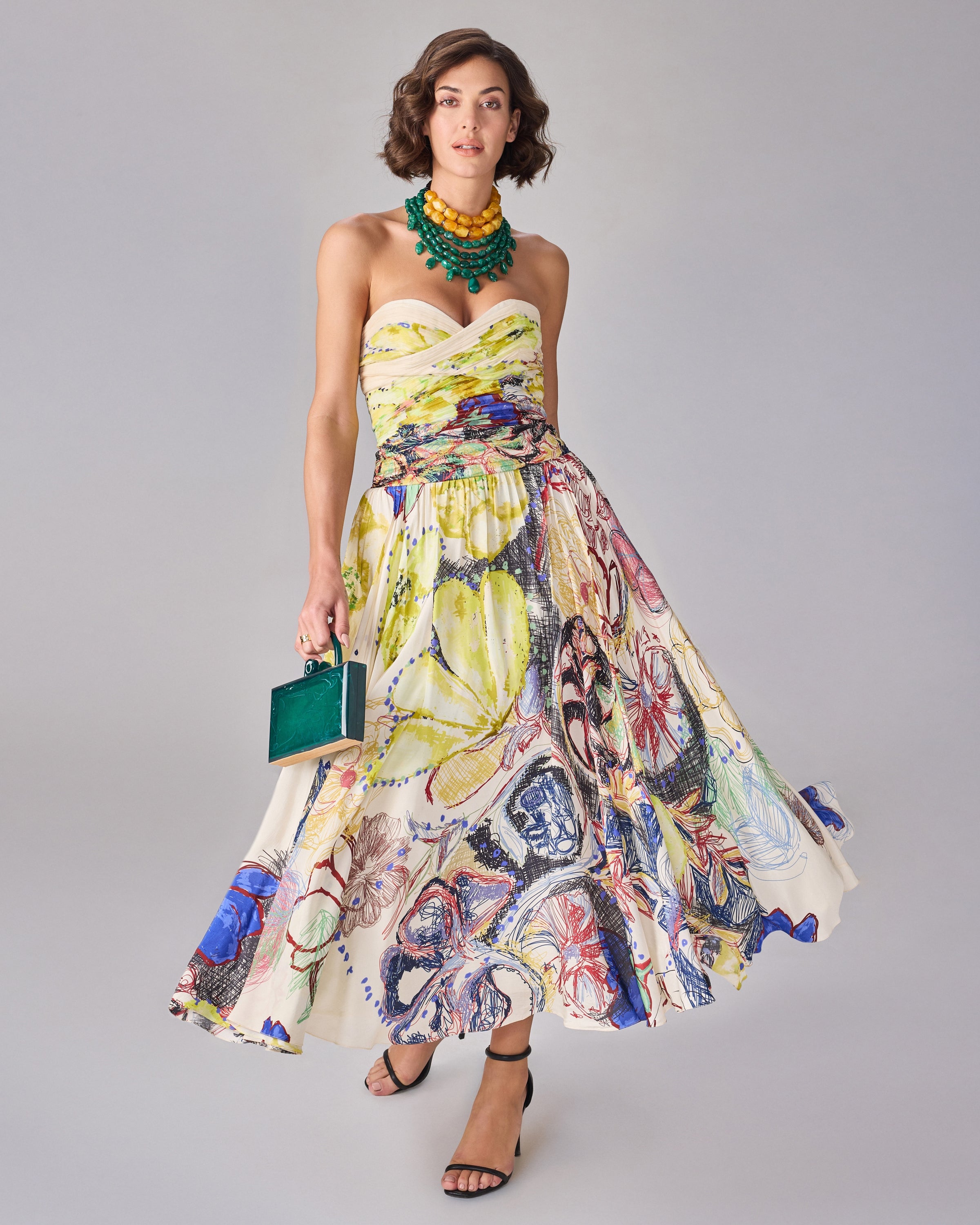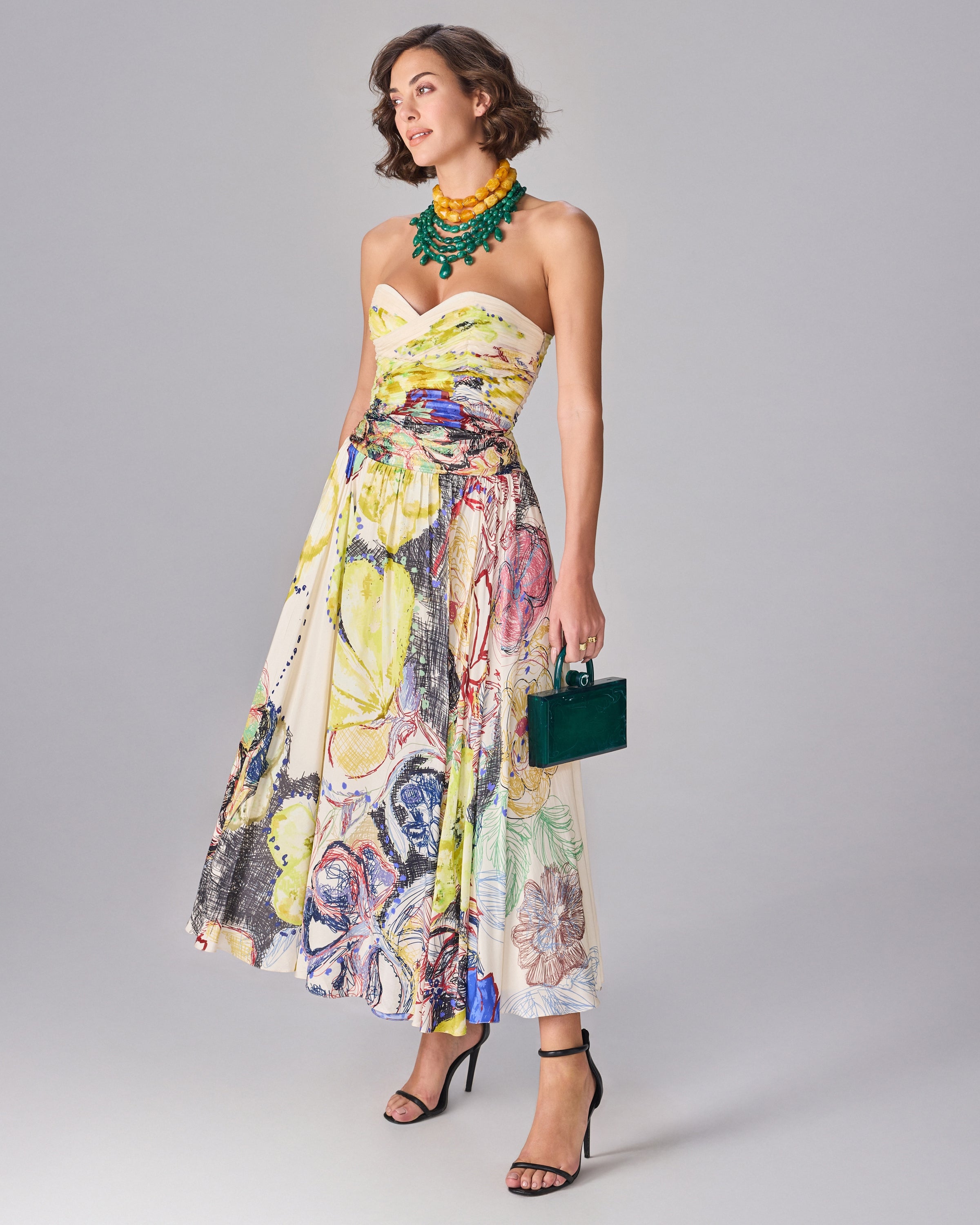 Elevate your wardrobe with the Nadia dress. Featuring a stunning abstract floral print, this midi flared dress will turn heads. The strapless sweetheart neckline and surplice bodice add a touch of femininity to this versatile piece. Embrace elegance and make a statement at any occasion.