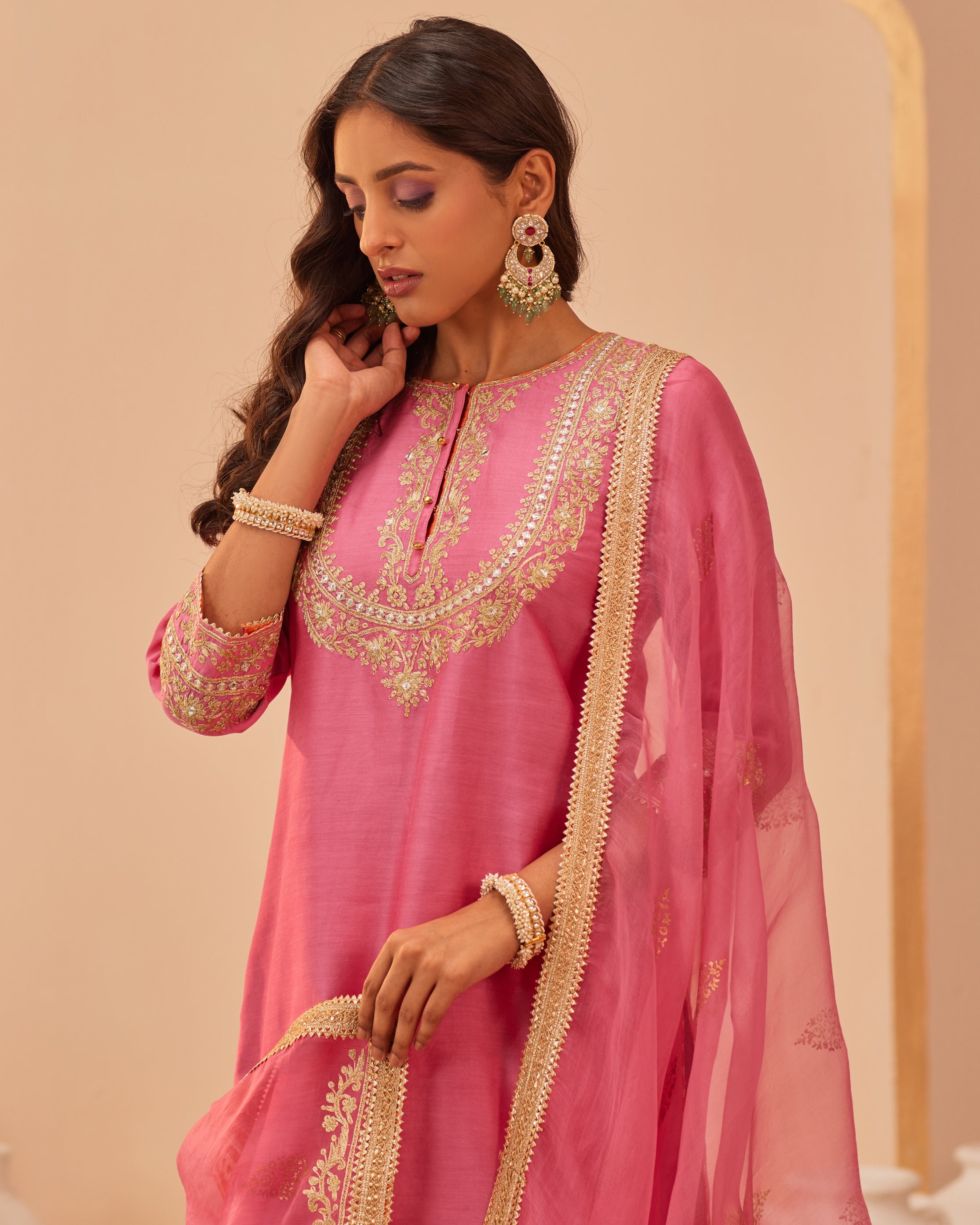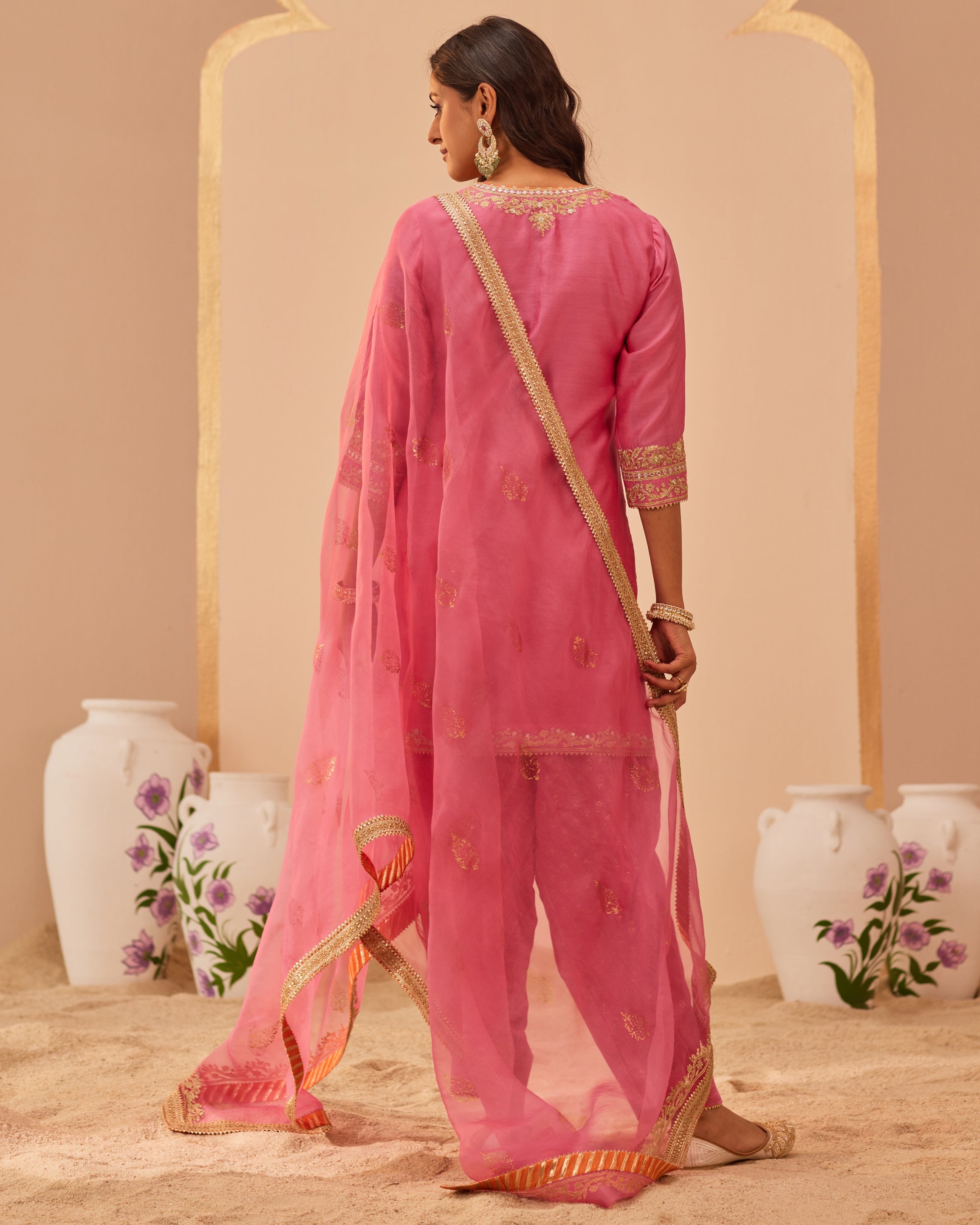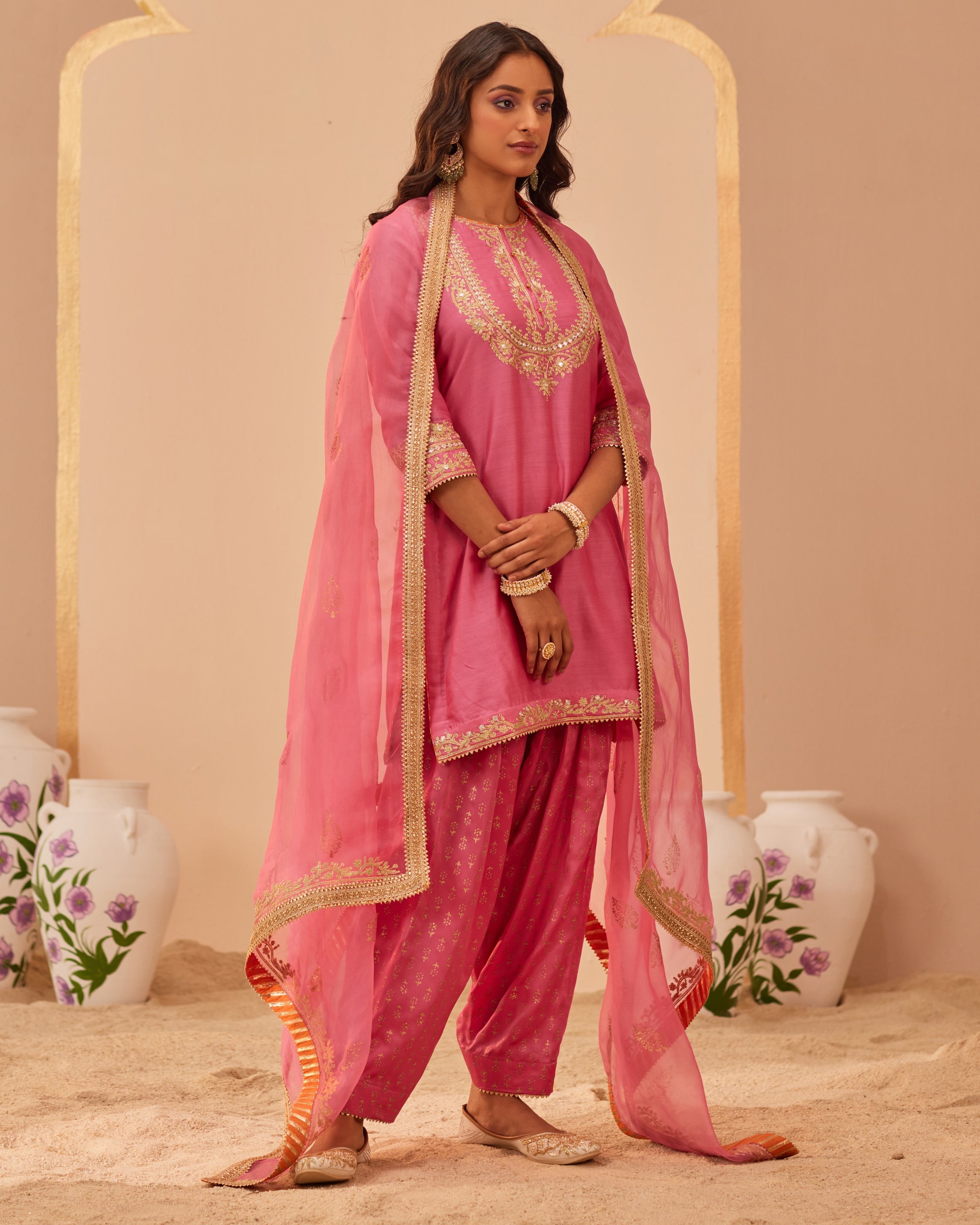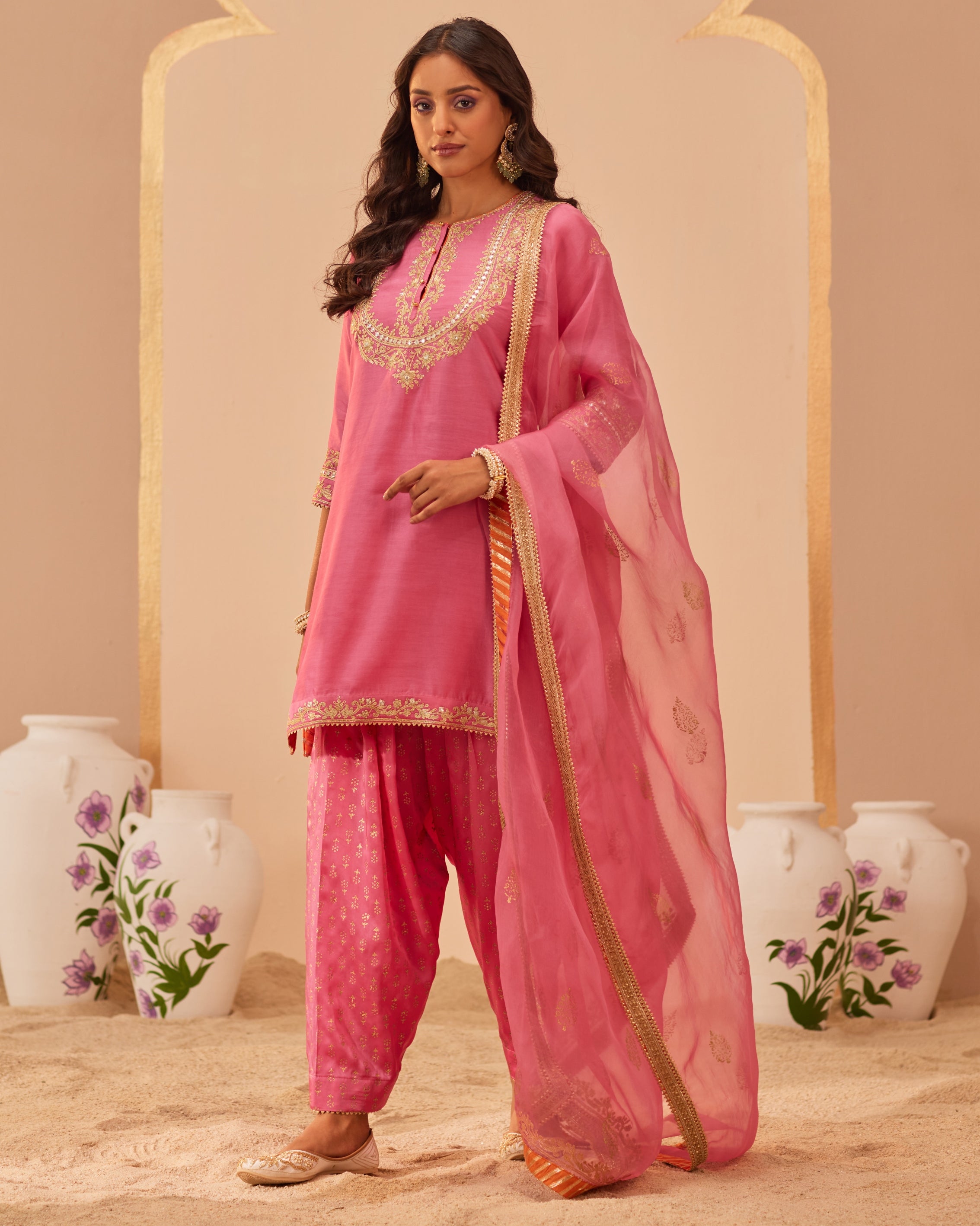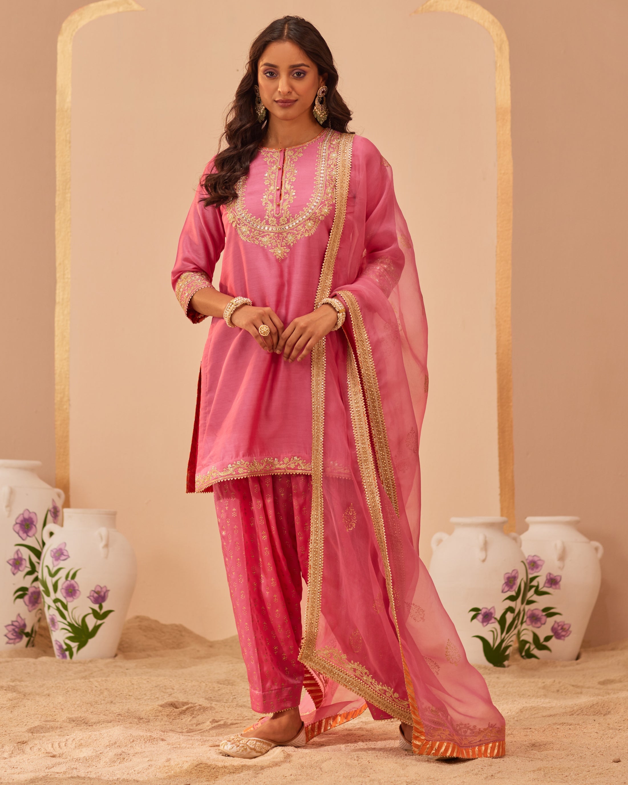 This ensemble is made in pure silk chanderi, a bamberg satin salwar teamed up with a silk organza dupatta. The kurta has a zero neck with a placket and three-quarter sleeves. The outfit is adorned with a signature block print and is highlighted with tilla and patra embroidery. It is finished with a pure benarsi fabric and gota detailing.